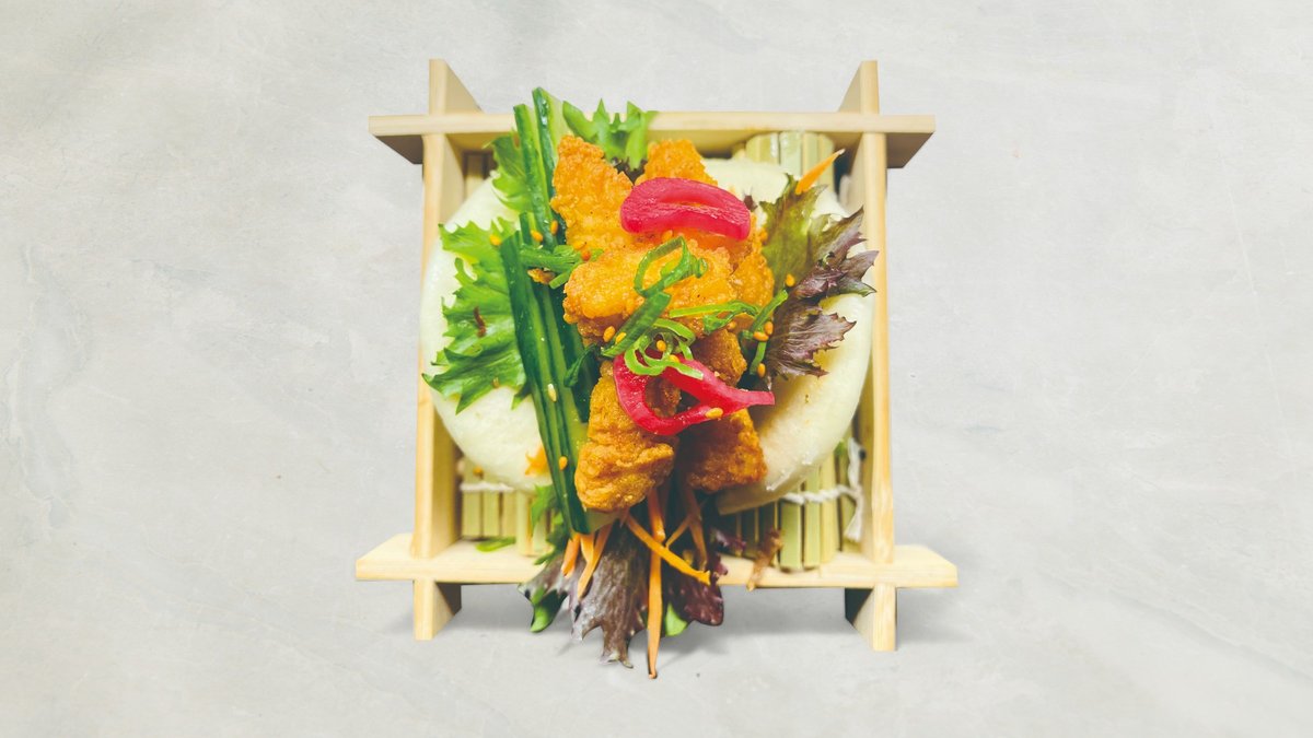 Lun kinesisk bao-bolle med fyld af kylling karaage, chilimayo, teriyaki, gomadressing, mix-salat, gulerødder, agurk, marinerede rødløg, forårsløg og sesam.
