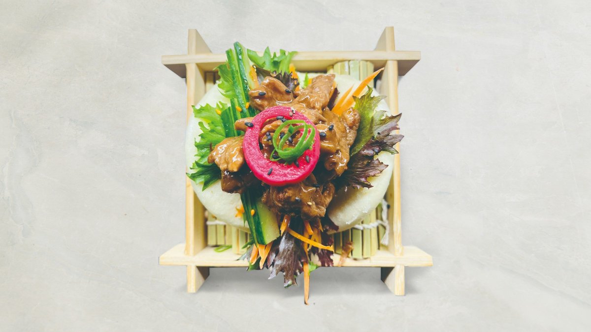 Lun kinesisk bao-bolle med fyld af oksekød, teriyaki, gomadressing, mix-salat, gulerødder, agurk, marinerede rødløg, forårsløg og sesam.
