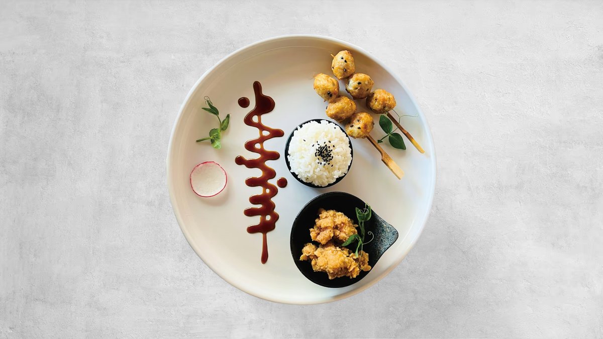 Forretter: 1 x edamame-bønner 1 x sushi-ris Sticks: 2 x laks 2 x kongerejer 2 x kyllingekødboller 2 x kyllingebryst.