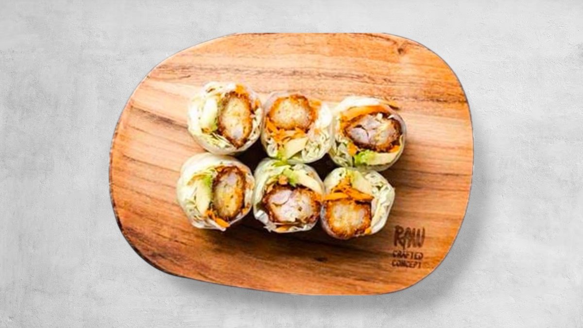 Crispy kylling, avocado, agurk, gulerødder og spæde salatblade serveres med goma dressing.