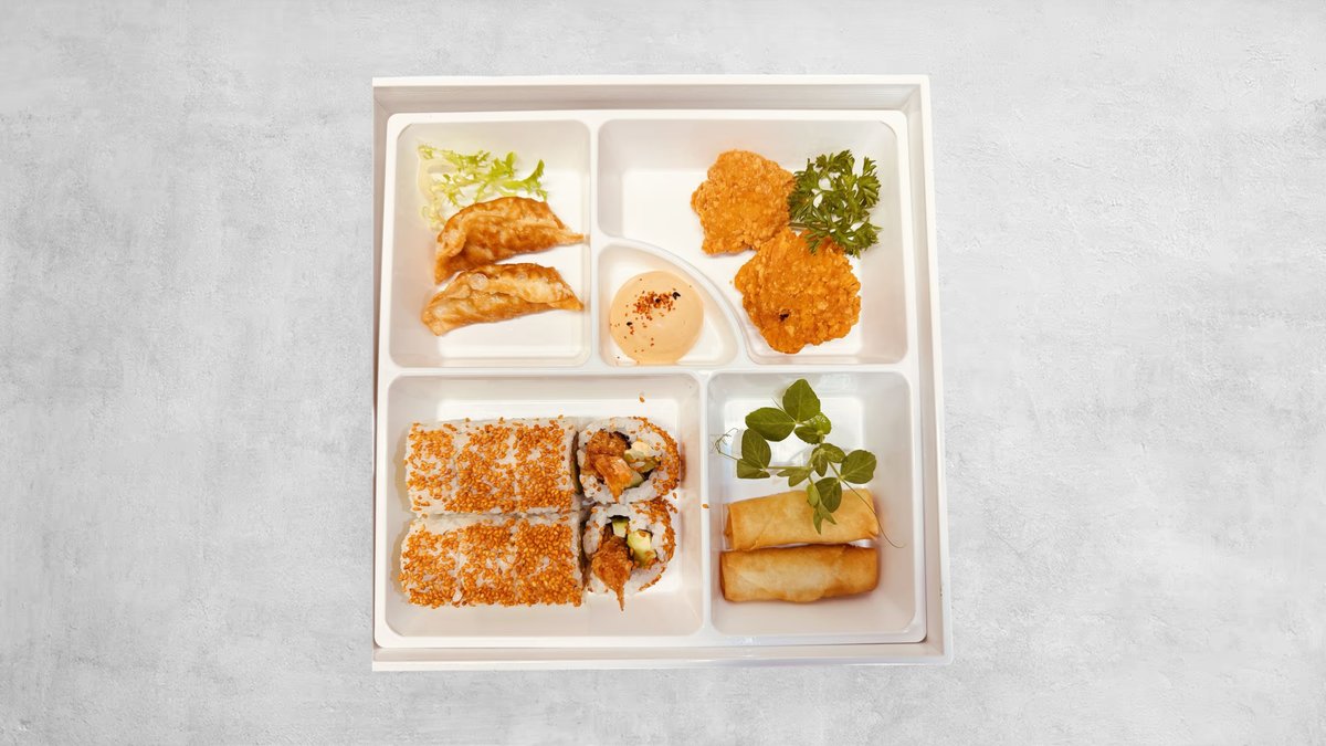 Forretter:2stk dumpnings,2 stk karaage,4stk mini forårsruller Nigiri :2stk Tun,2stk laks Toppet maki:8stk øresundroll,8 stk mangohus Uramaki:8stk Alaska,8stk California