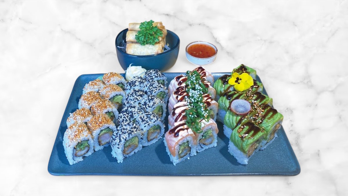 Forretter:8stk Mini Forårsruller 5stk Croquettes med ris og laks Nigiri:4stk laks,4stk Grillet laks,4stk Tun,4stk Reje Uramaki:8stk Spicy Hawaii ,8stk Laks Toppet Maki:8stk Red Fusion 8stk Viking 8stk Rainbow Futomaki:6stk California 6stk Ebi Tempura 6stk Grillet Laks