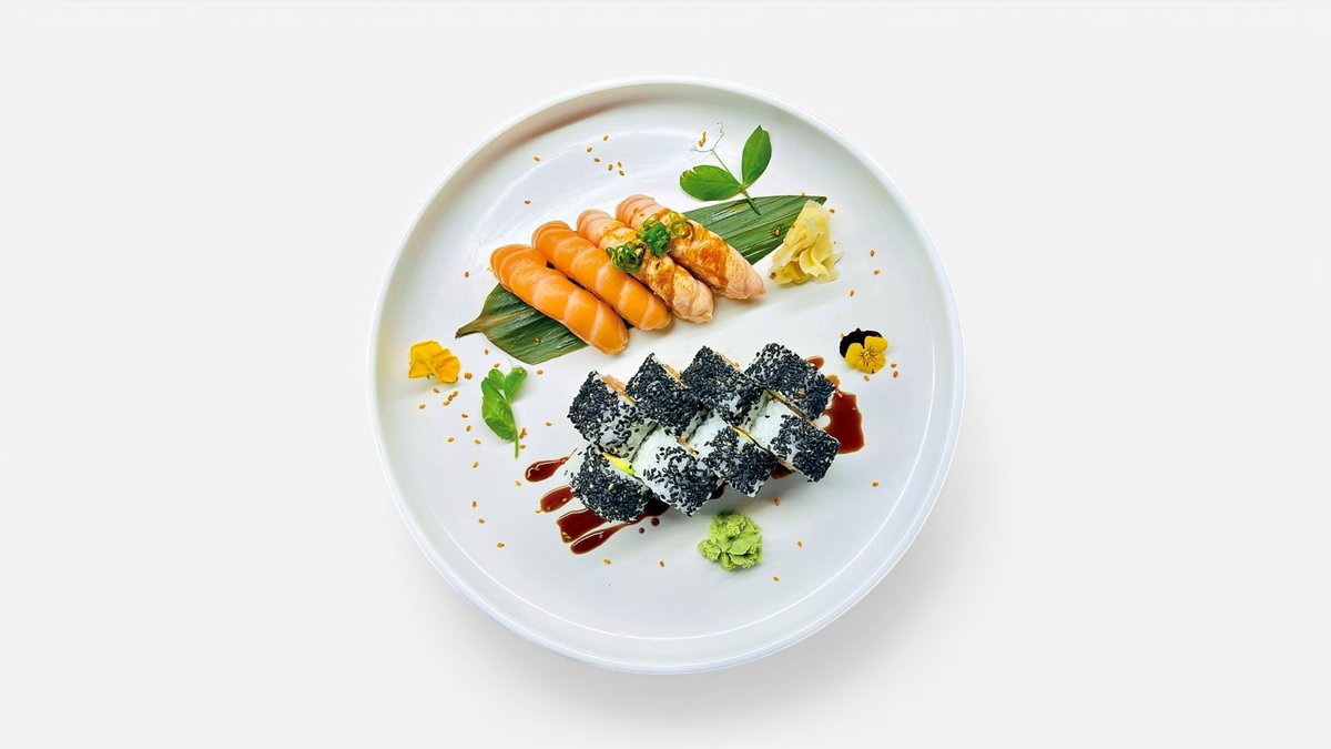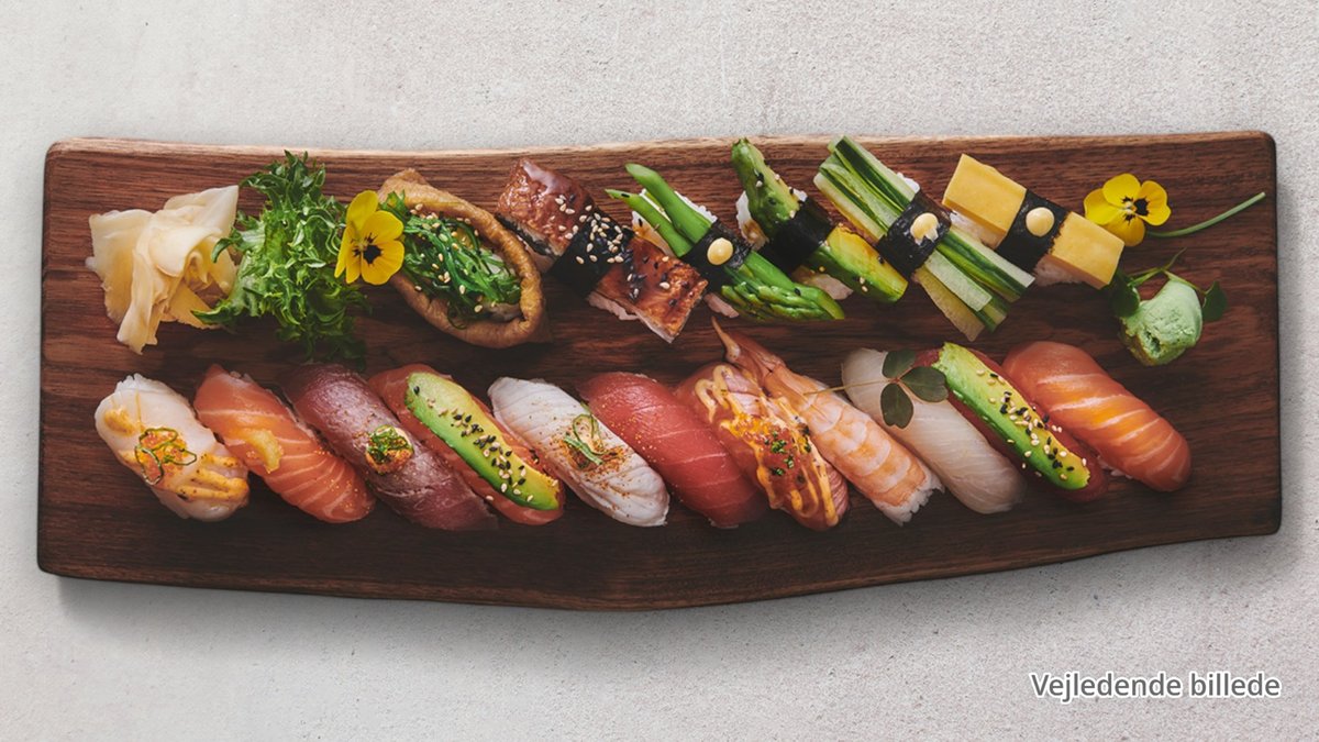 Forretter: Edamame-bønner Nigiri: 2 x laks 2 x tun 2 x rejer 2 x grillet laks Hosomaki: 8 x laks Kaburimaki: 8 x Øresund Roll Futomaki: 6 x Tempura-reje Rispapir: 6 x Dragon.