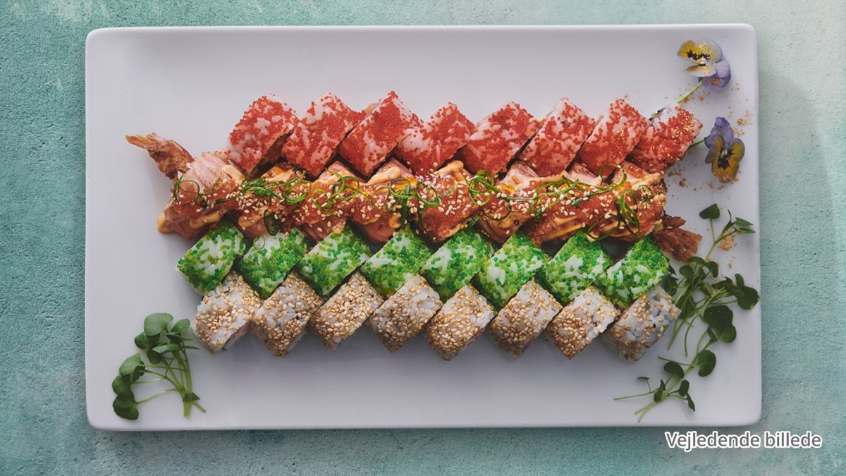 Forretter: 4stk Mini Forårsruller Toppet Maki:8stk Øresund Roll 8stk Viking Futomaki:6stk California 6stk Ebi Tempura 6stk Grillet Laks