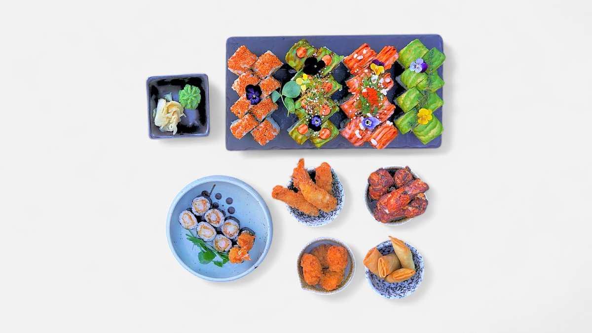 Forretter: 2 stk Crispy crouqettes med ris og laks, 2 stk kylling karaage Edamame med salt og citron. Toppetmaki: 8stk Mangohus, 8stk Viking, 8stk Øresundroll. Chrunchy futomaki: 6 stk Chrunchy Tuna. Nigiri: 2stk grillet tun & 2 stk laks.