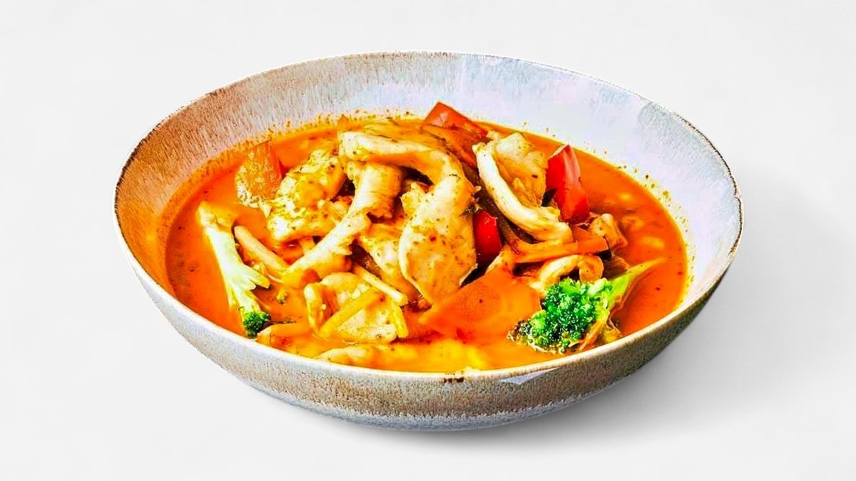 Thai rød karry med kokosmælk og blandet grøntsager. Vælg protein i mellem tofu, kylling, oksekød, and, kongerejer og laks.