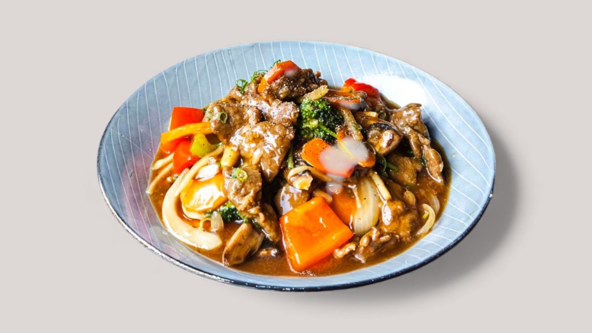 Udonnudler med sukkerærter, porrer, bønnespirer og peberfrugt. Tilberedes med valgfri protein.