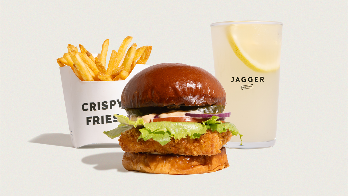 Økologisk burgerbolle, økologisk friskhakket dansk oksekød, tomat, salat og løg. Jagger dip, pickles og cheddar. Serveres med pommes frites, og en valgfri sodavand, vand eller dåseøl. Mulighed for at tilføje en valgfri dip.
