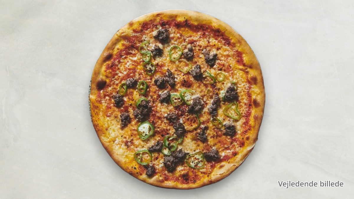 Tomat, ost, peperoni, kylling og hakket oksekød.