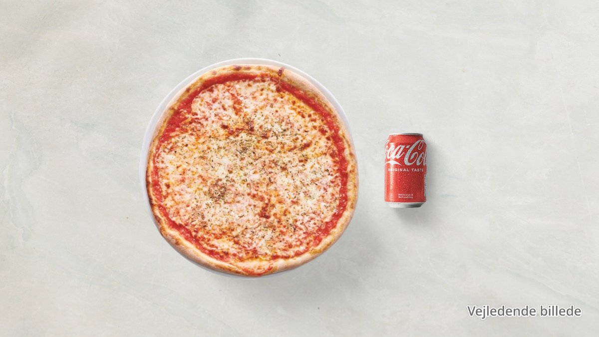 Valgfri pizza serveret med én valgfri 0,33 l sodavand.
