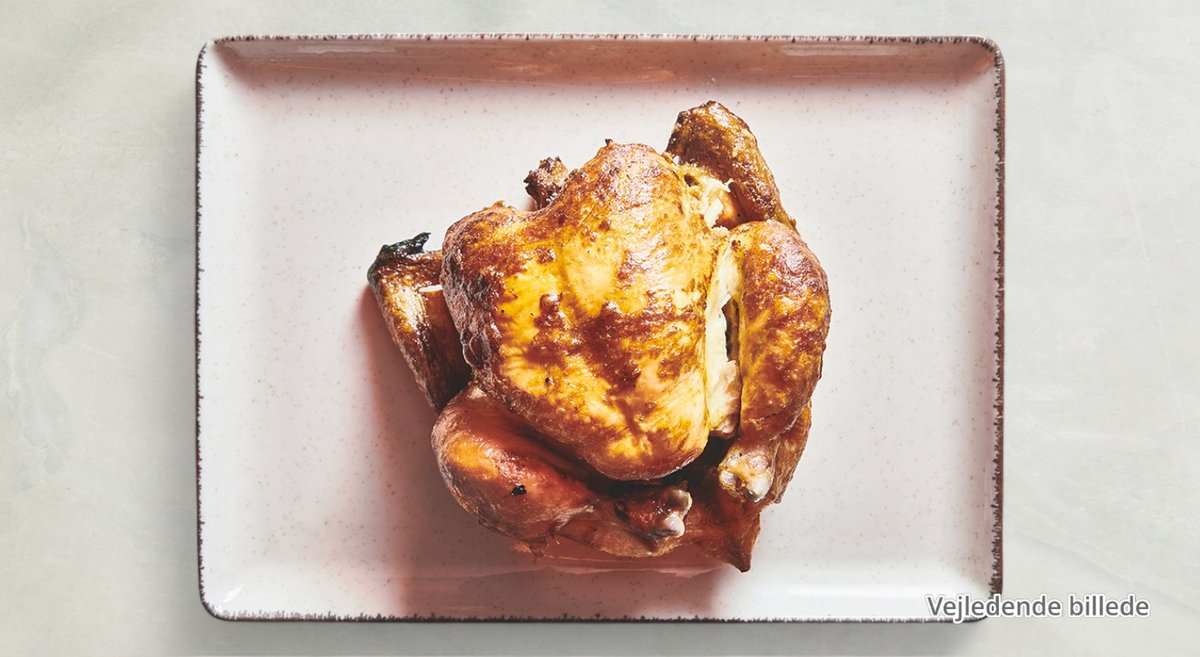 En halv kylling. Serveres med salat, valgfrit tilbehør og valgfri dyppelse.