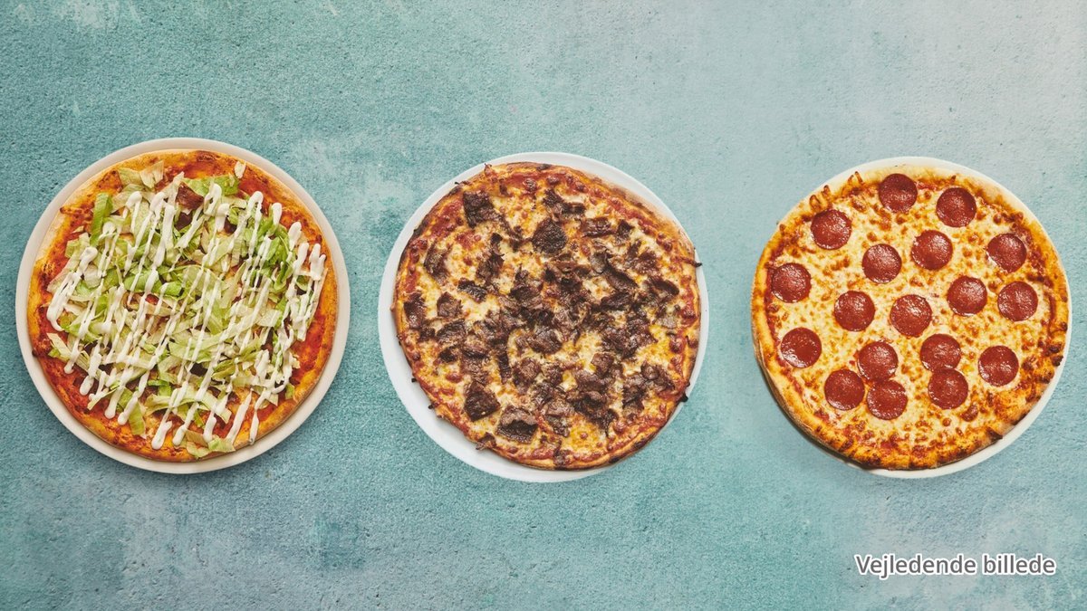 3 x Valgfrie pizzaer 1 x Valgfri 1,5 l sodavand 1 x Pommes frites