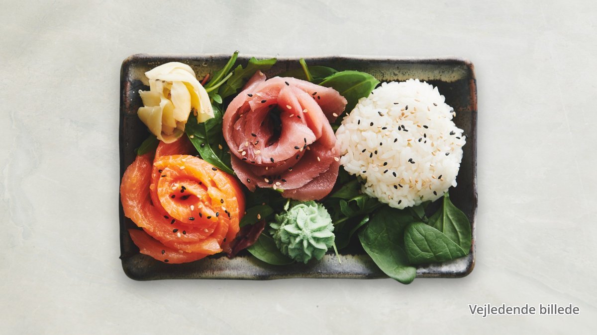 Nigiri: 3 x laks, 3 x flamberet. Futomaki: 6 x laks big. Uramaki: 8 x alaska, 8 x spicy laks. Hosomaki: 8 x laks.