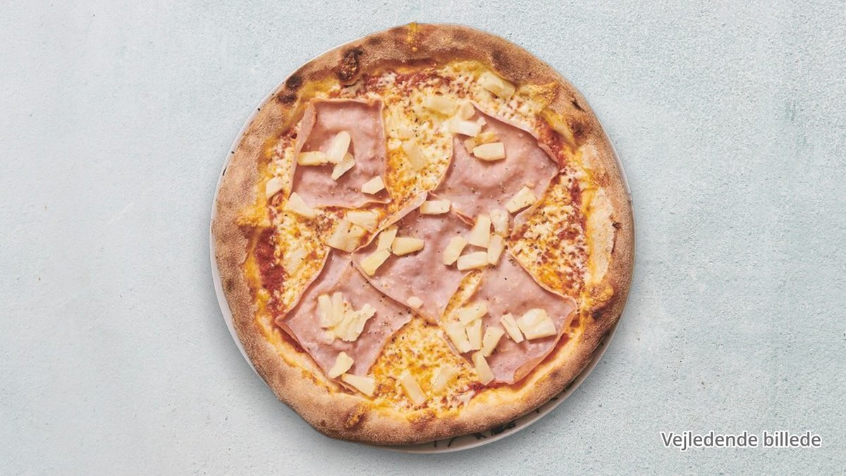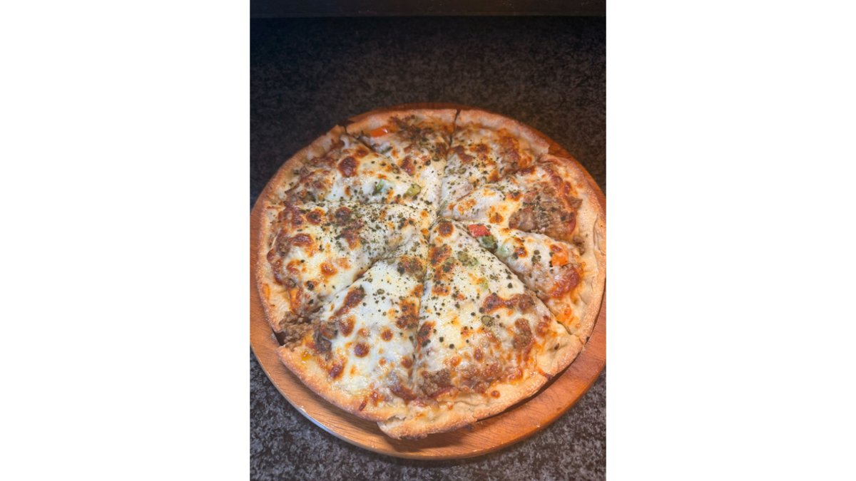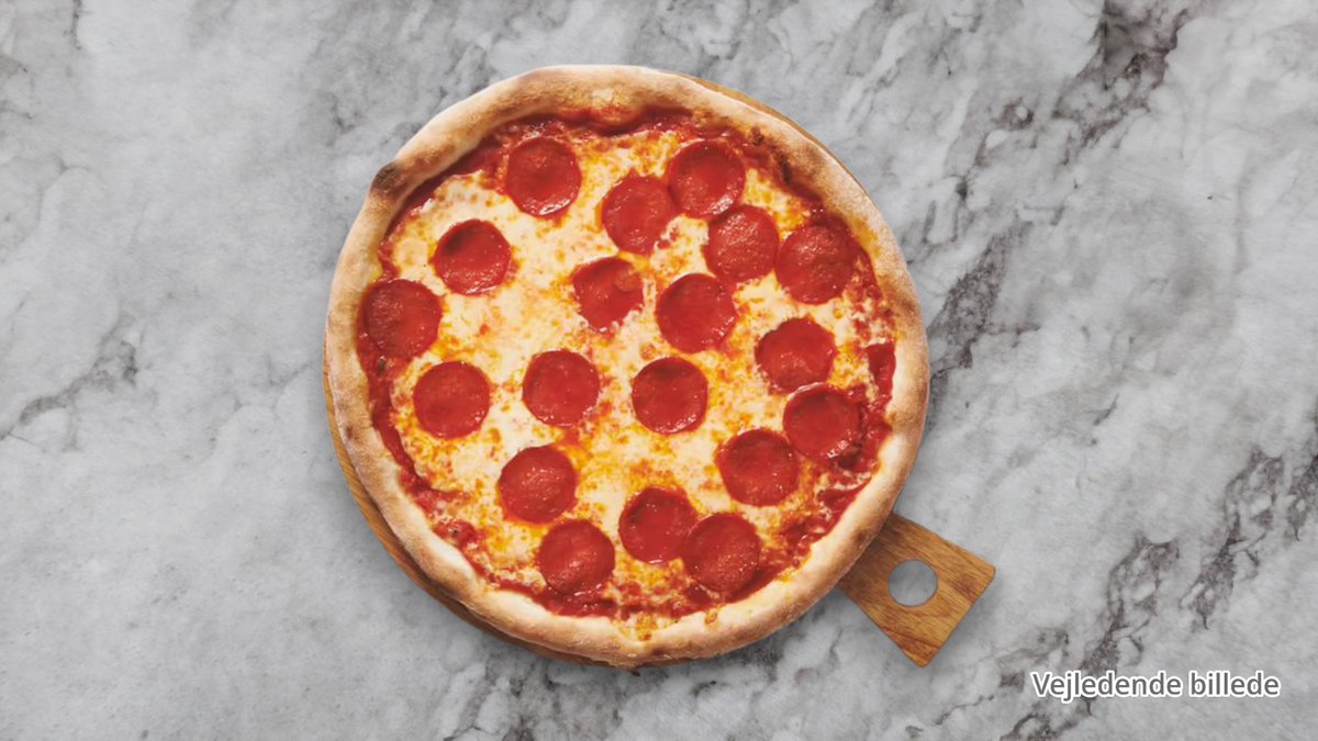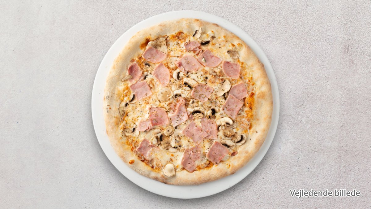 Tomatsauce, ost, pølse, champignon, peberfrugt og pålægspølse.