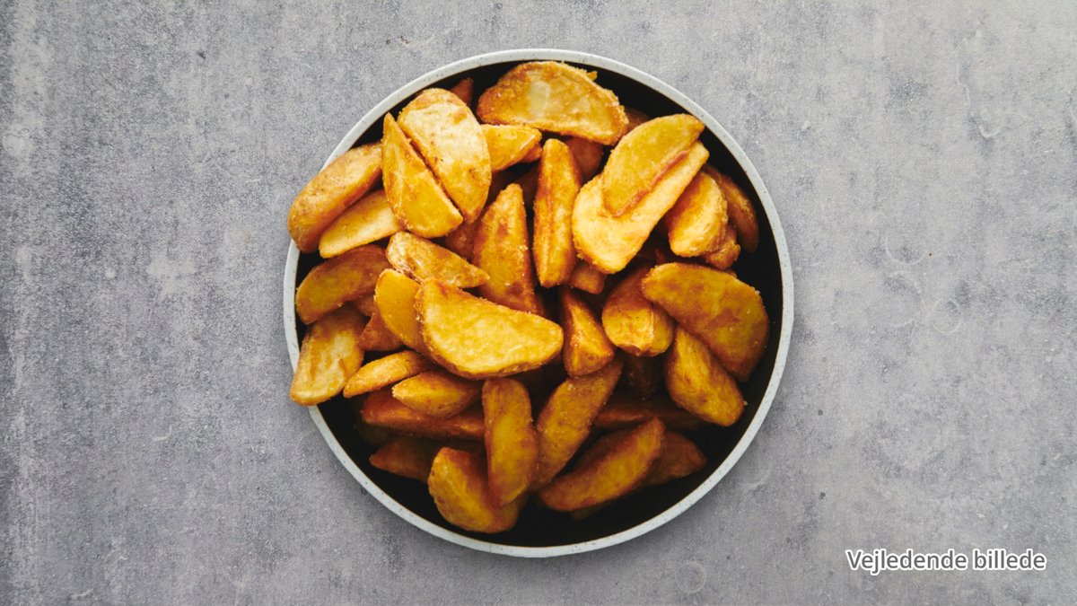 Serveret med pommes frites, salat og valgfri dyppelse.