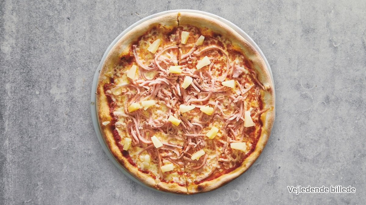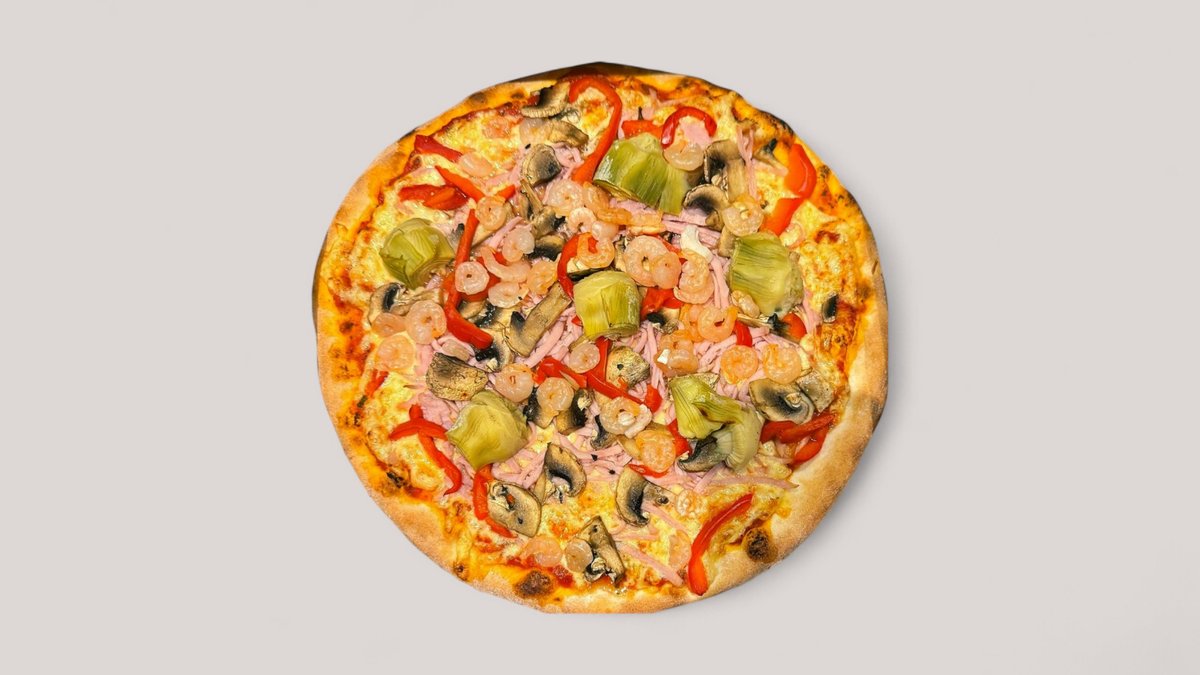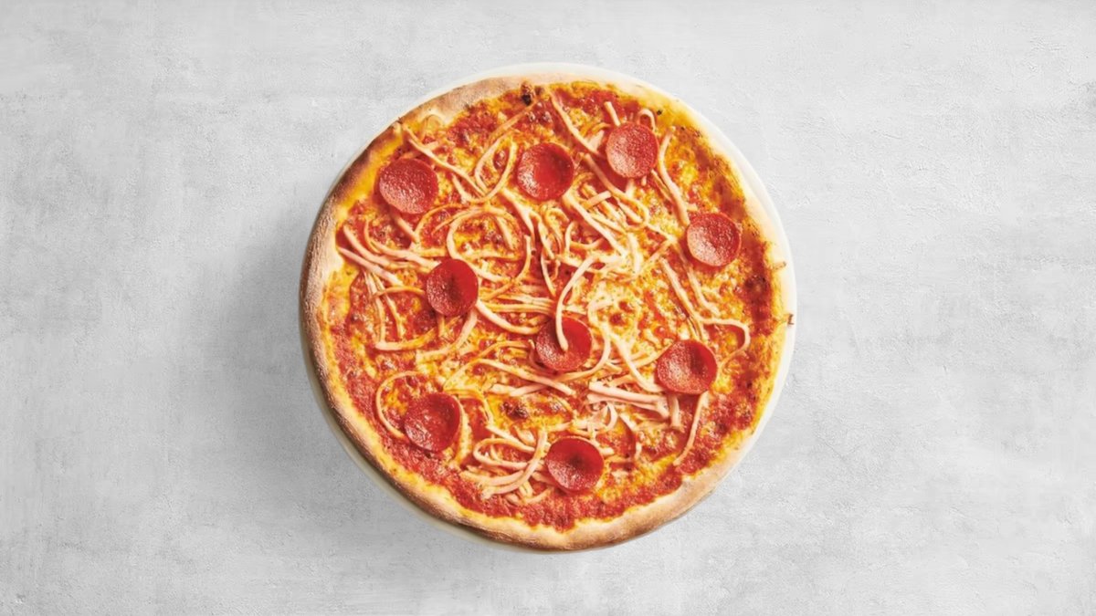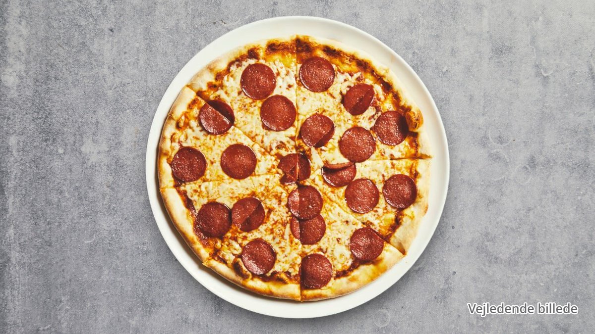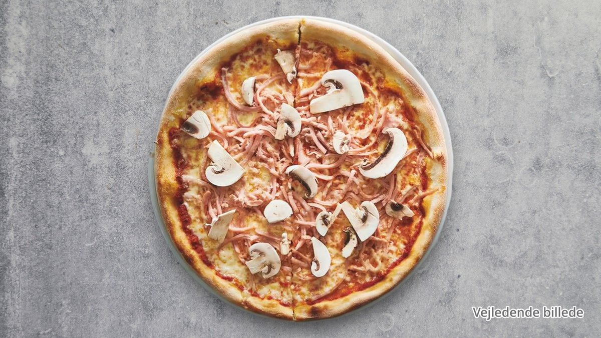 Tomat, ost, champignon, paprika, skinke og pepperoni.