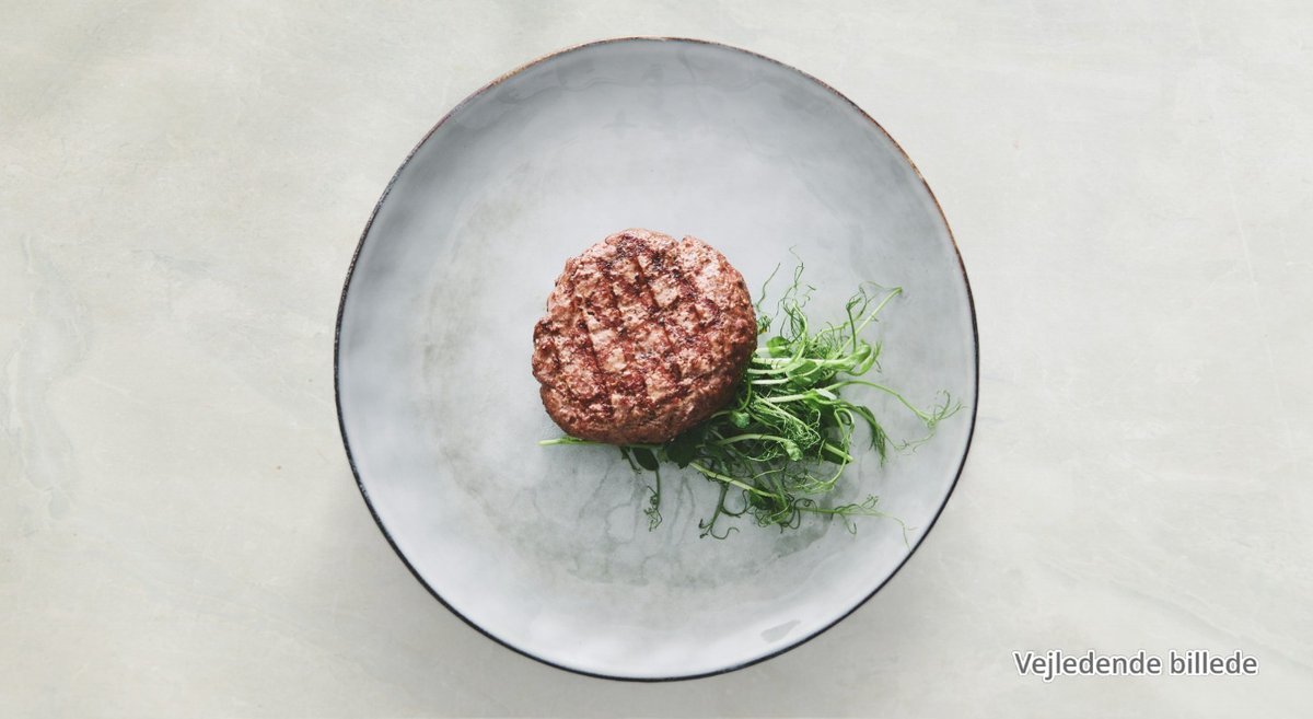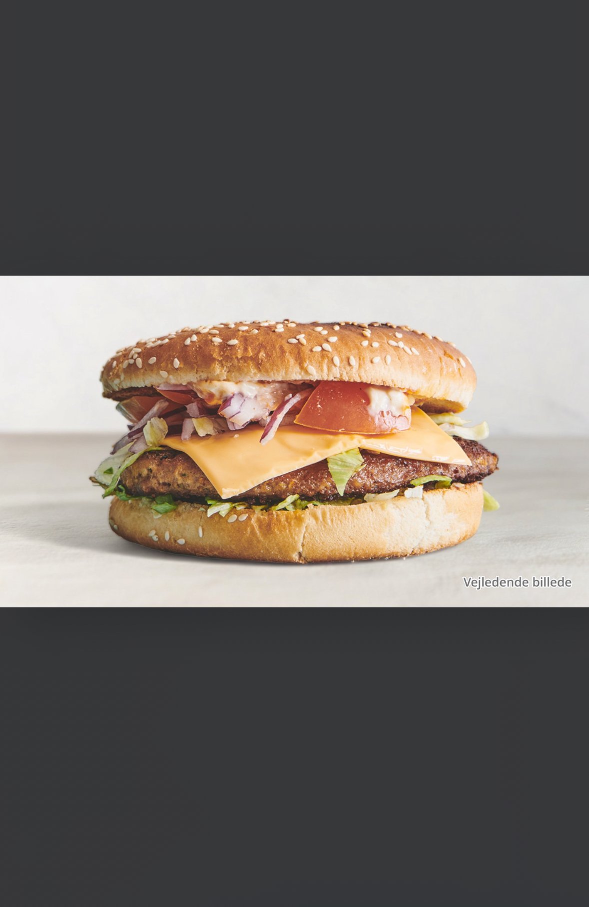 150 gram oksebøf, ost, salat, tomat, løg, agurk og burgerdressing.