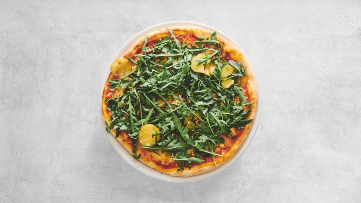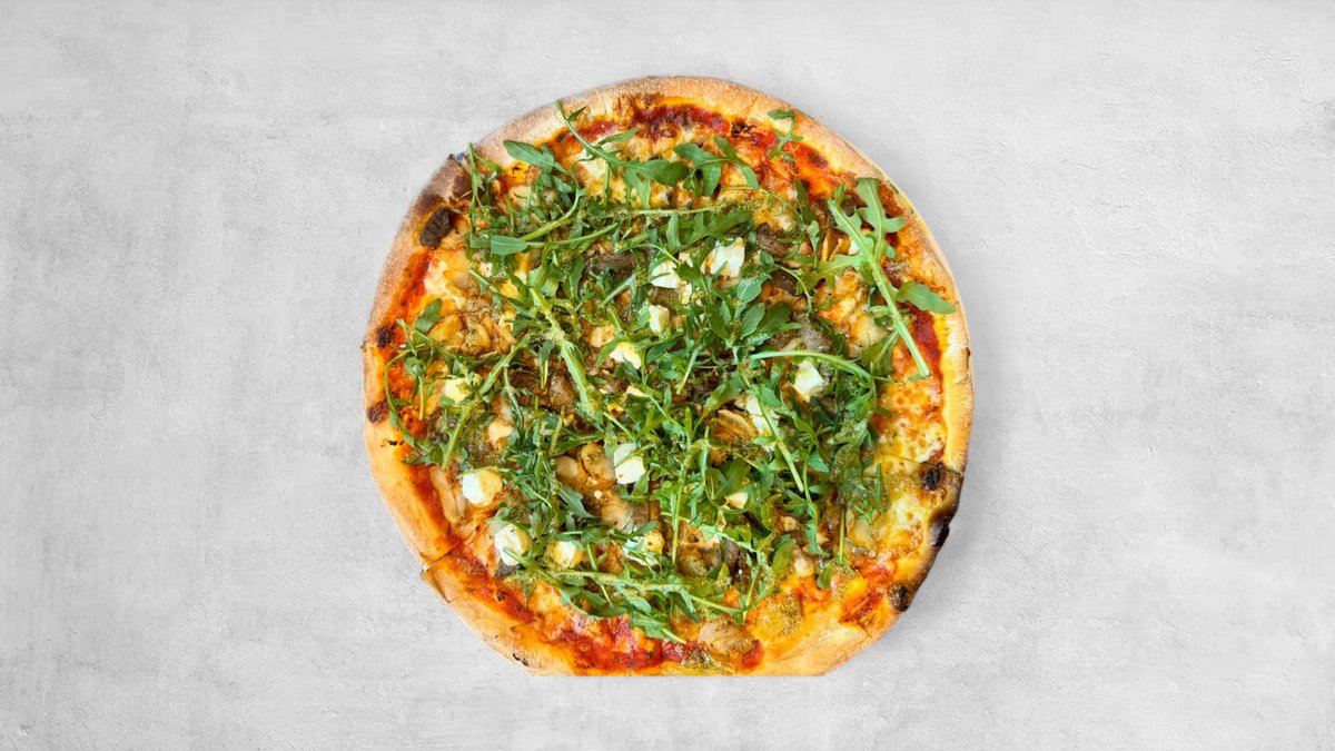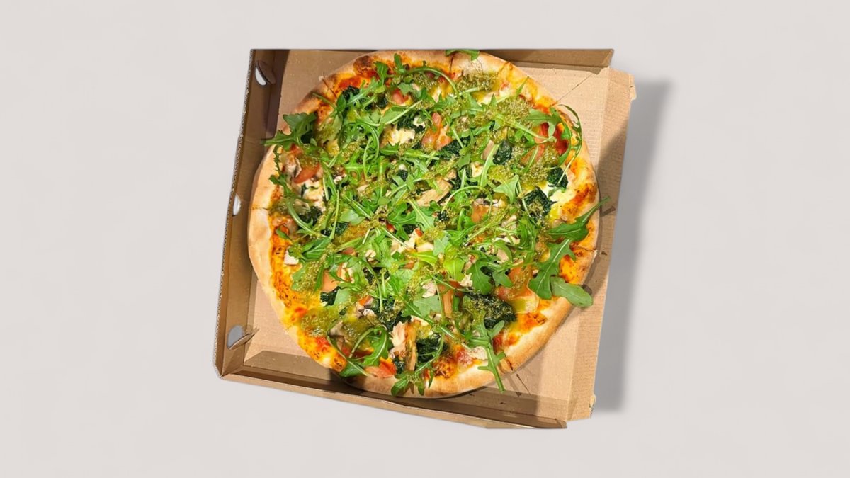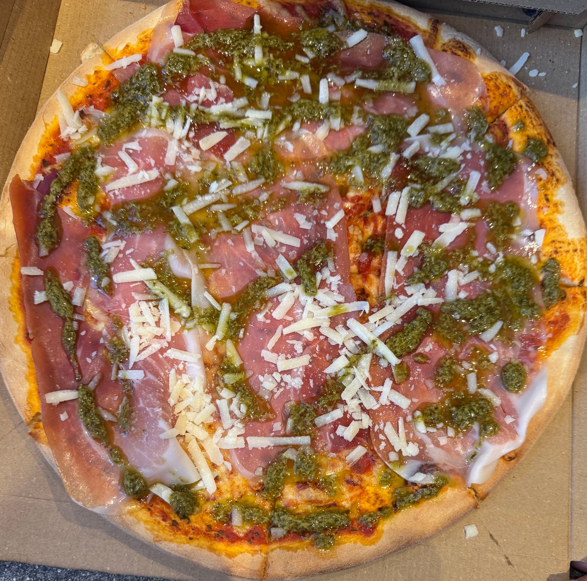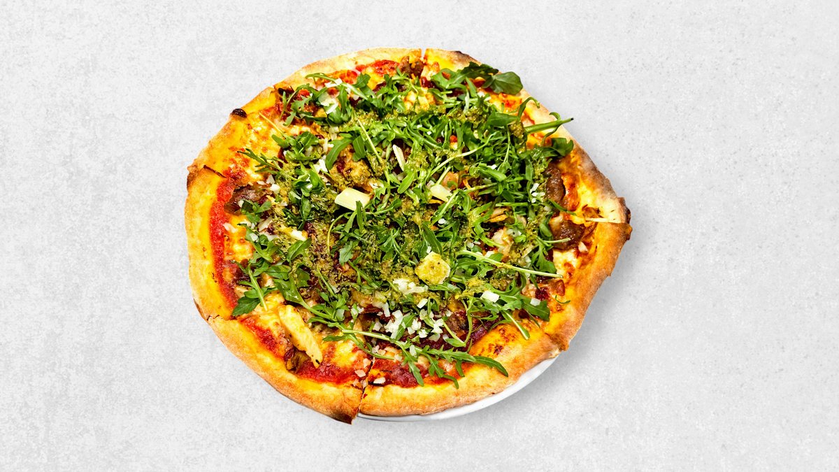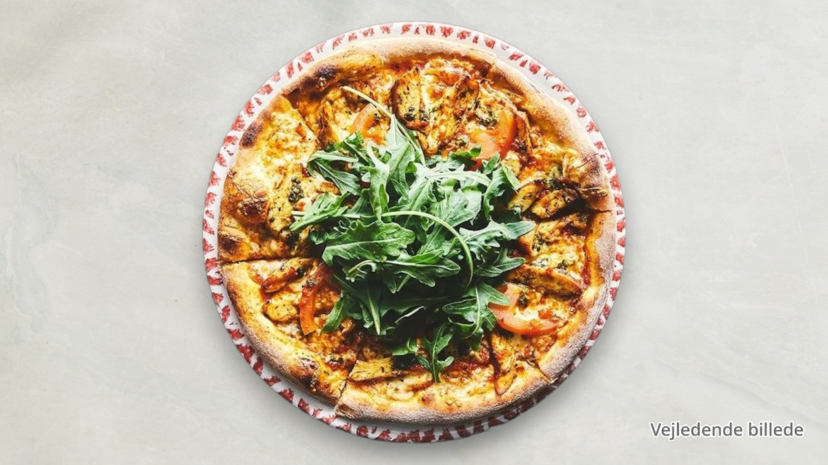 Tomat, ost, kebab, kylling, parmesan, rucola og pesto.