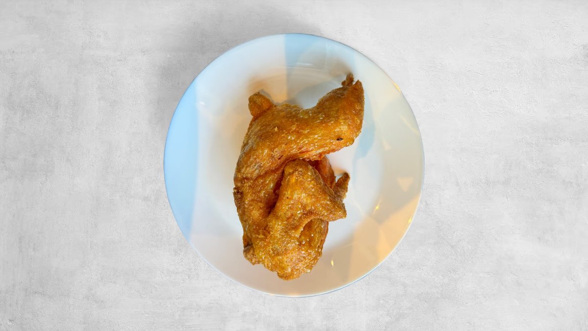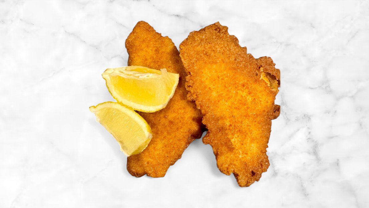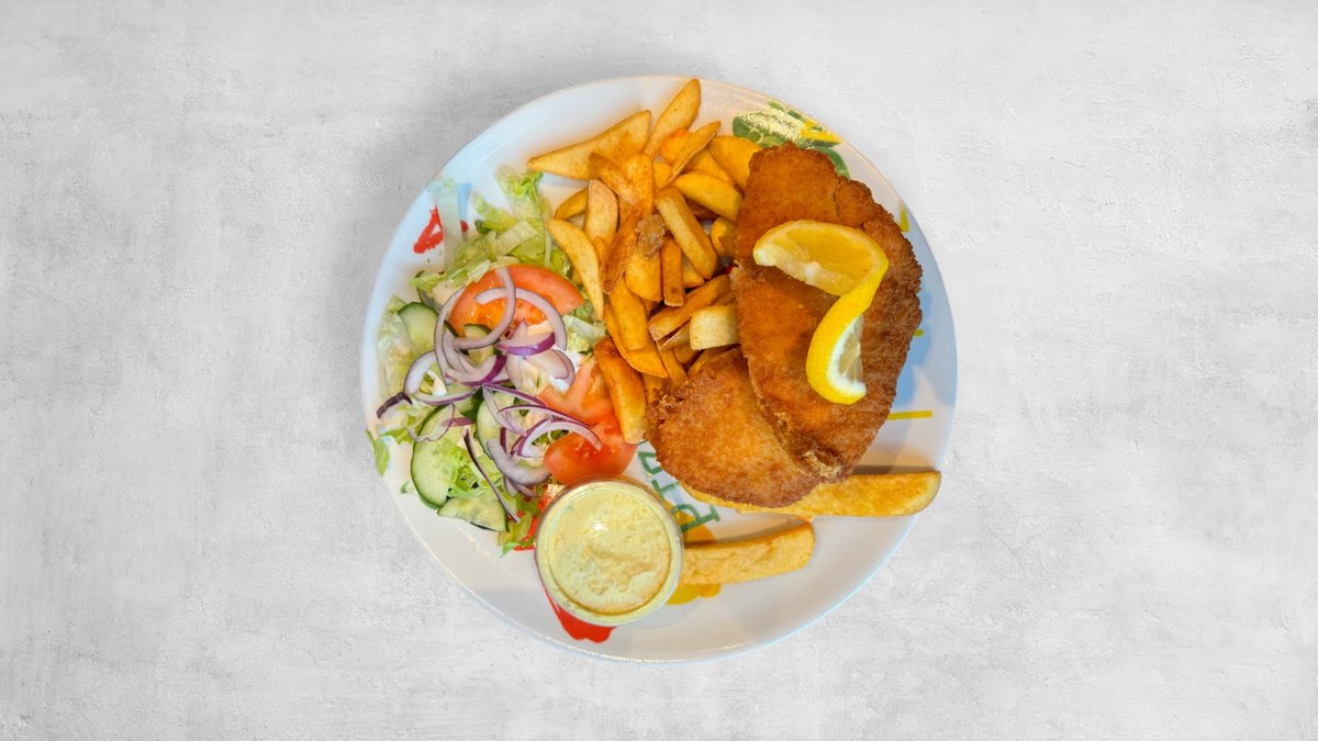 Serveret med pommes frites, frisk salat, tomater, agurker, løg, creme fraiche dressing og valgfri dyppelse.