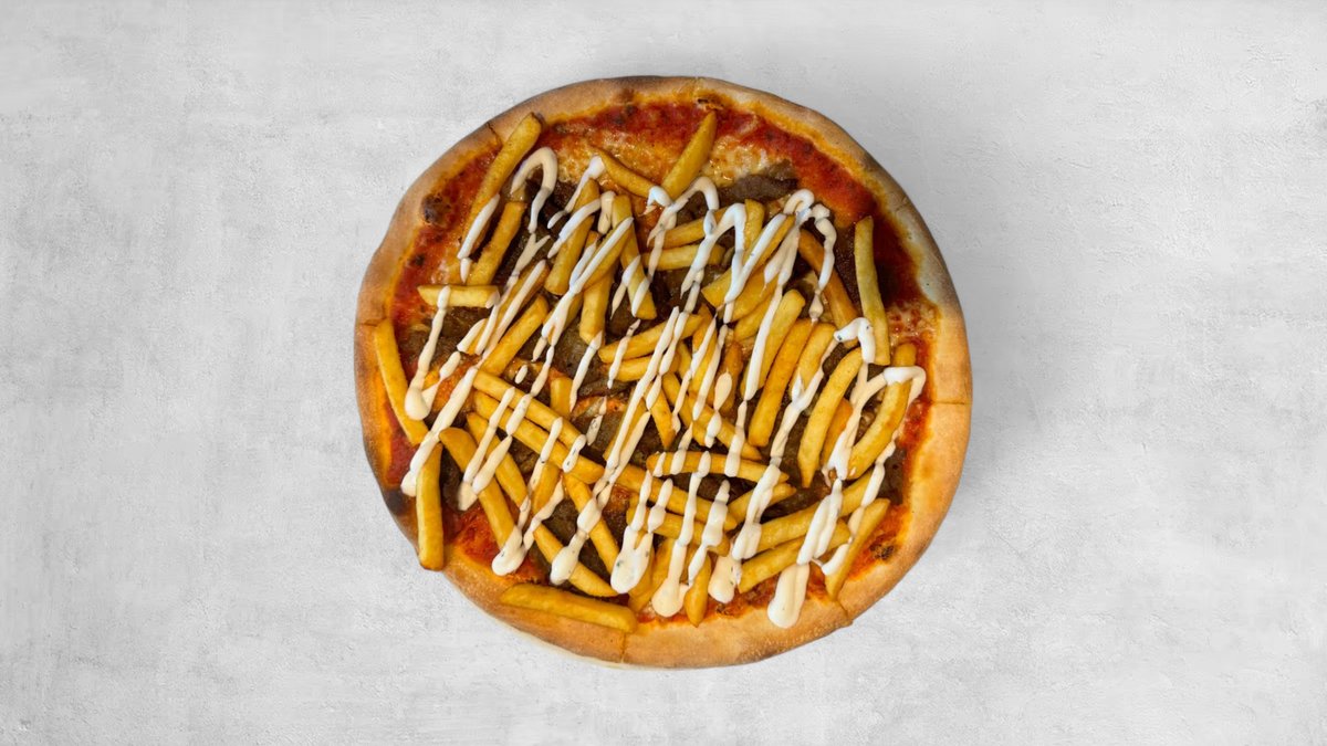 Tomat, ost, gorgonzola, chili, hvidløg, kebab og løg.