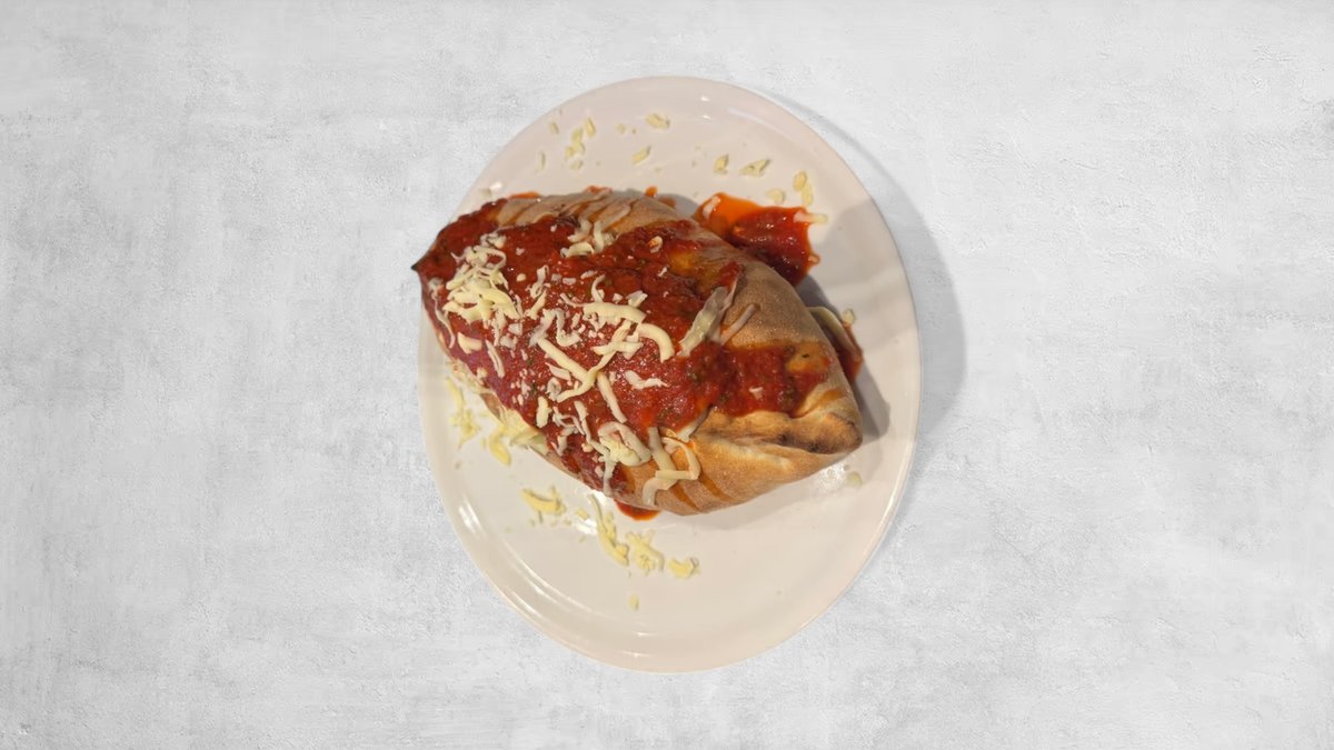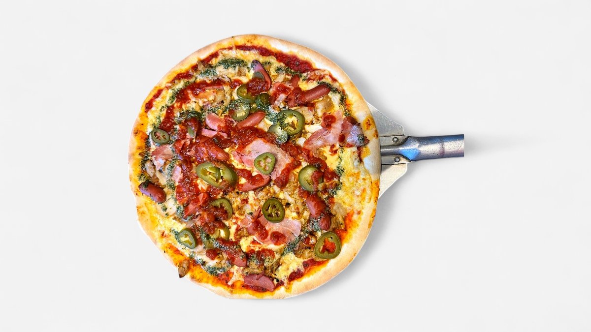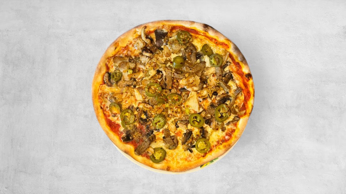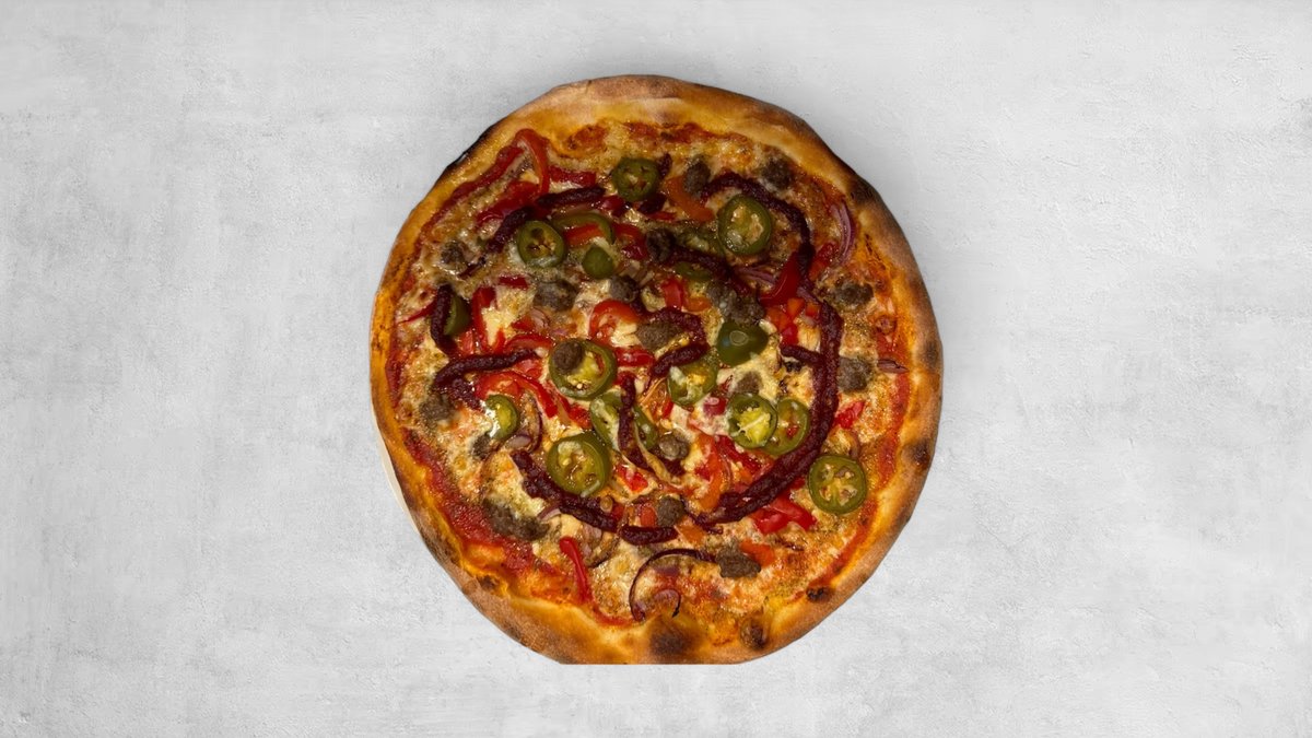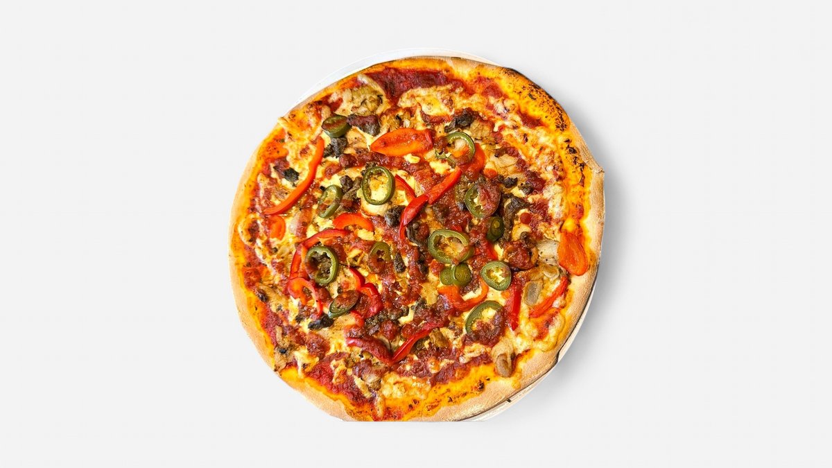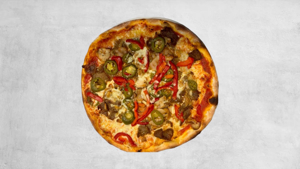 Tomat, ost, kødstrimler, kylling, løg, champignon, jalapeños, chili og hvidløg.