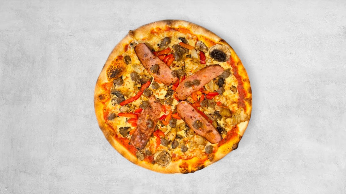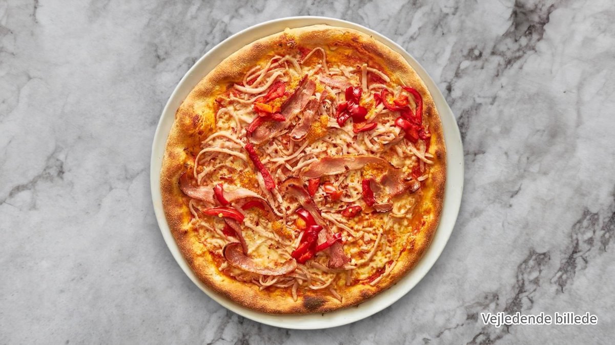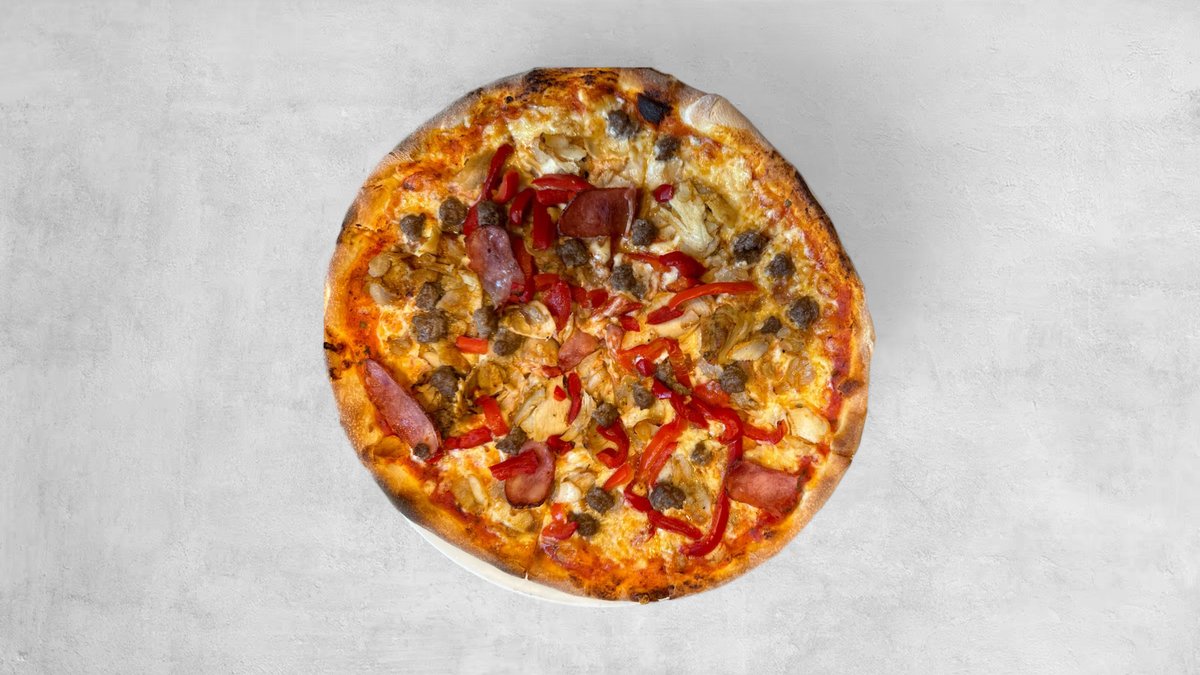 Tomat, ost, kylling, bacon, hakket oksekød, paprika, chili og champignon.