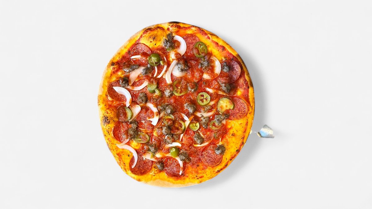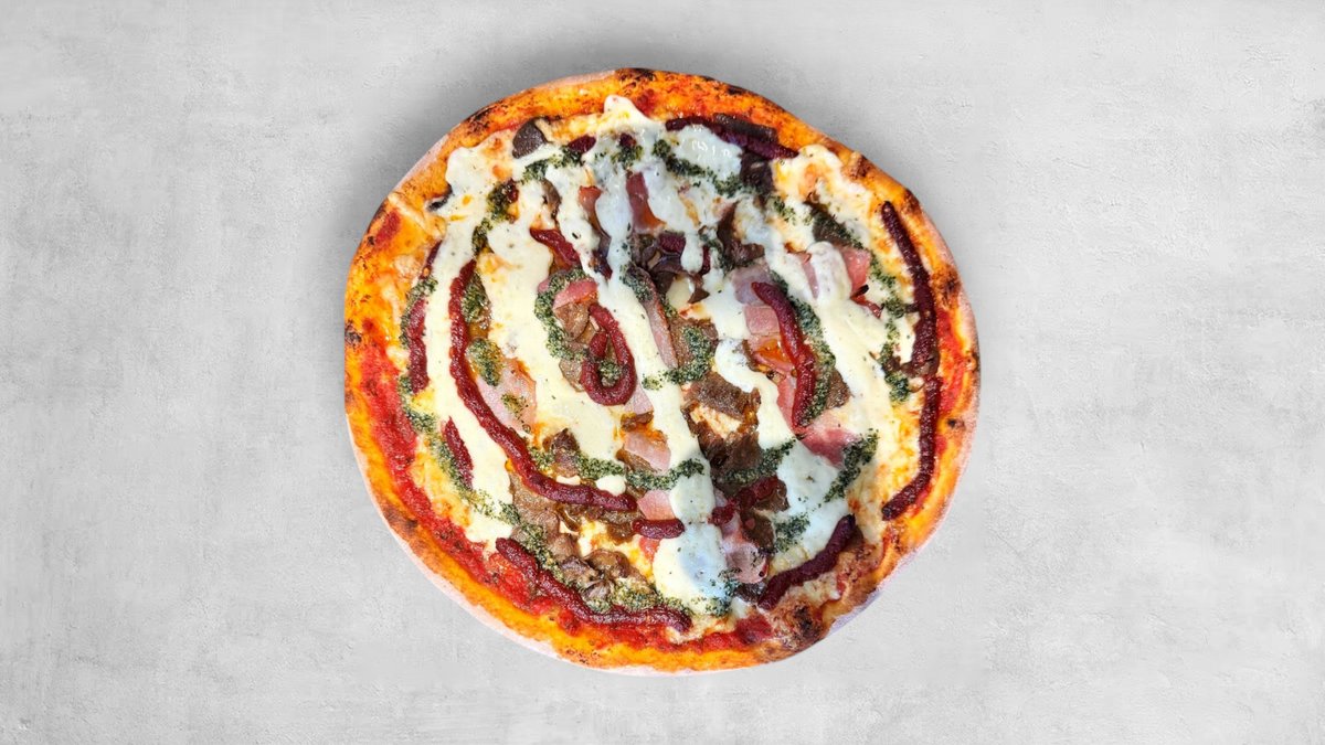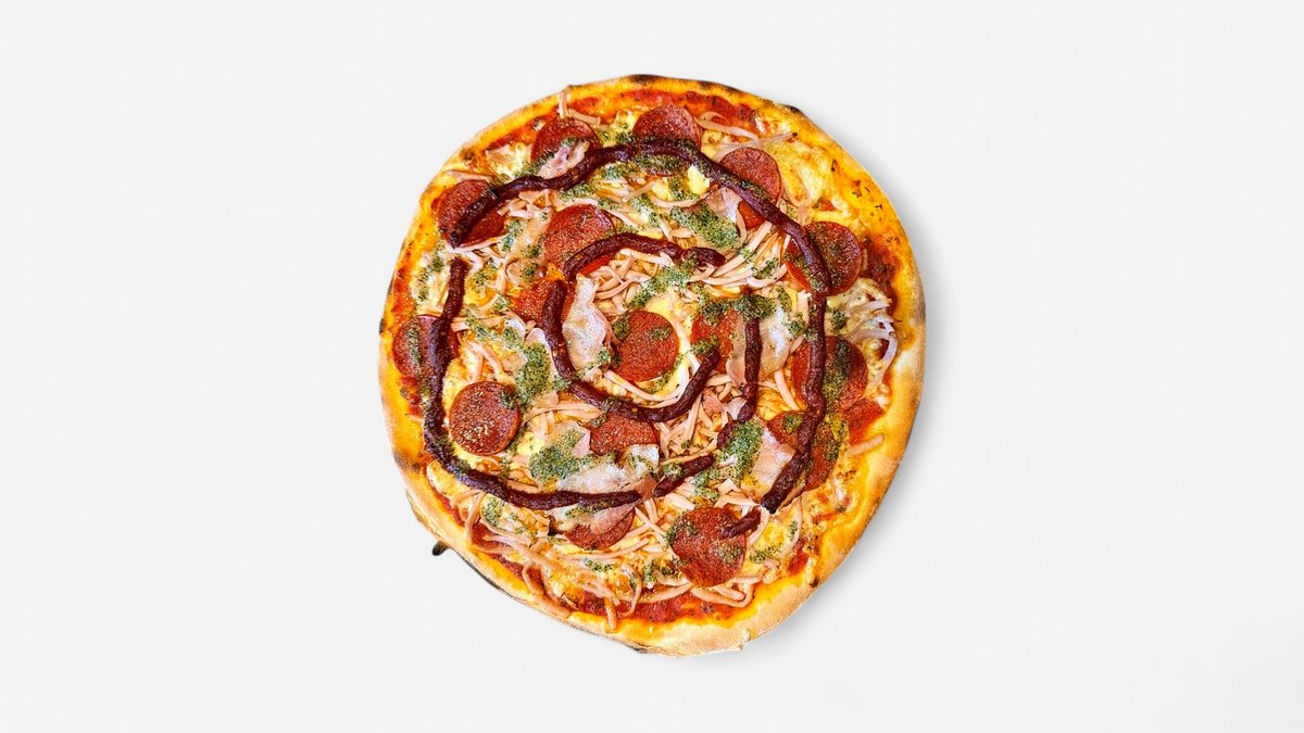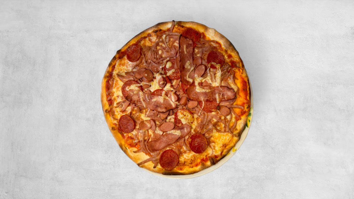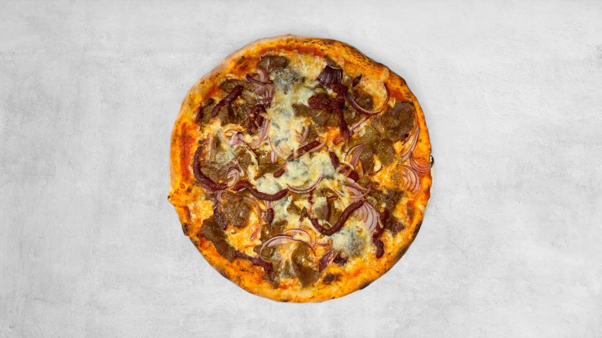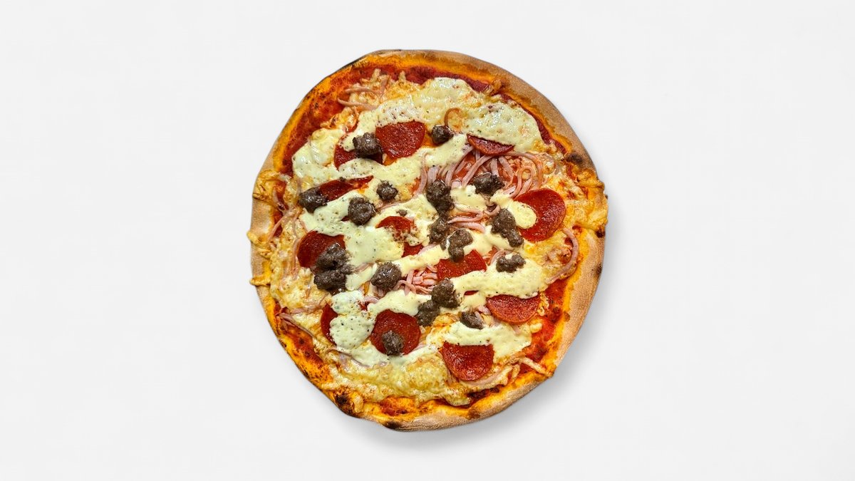 Tomat, ost, kødstrimler, bacon, pepperoni og gorgonzola.