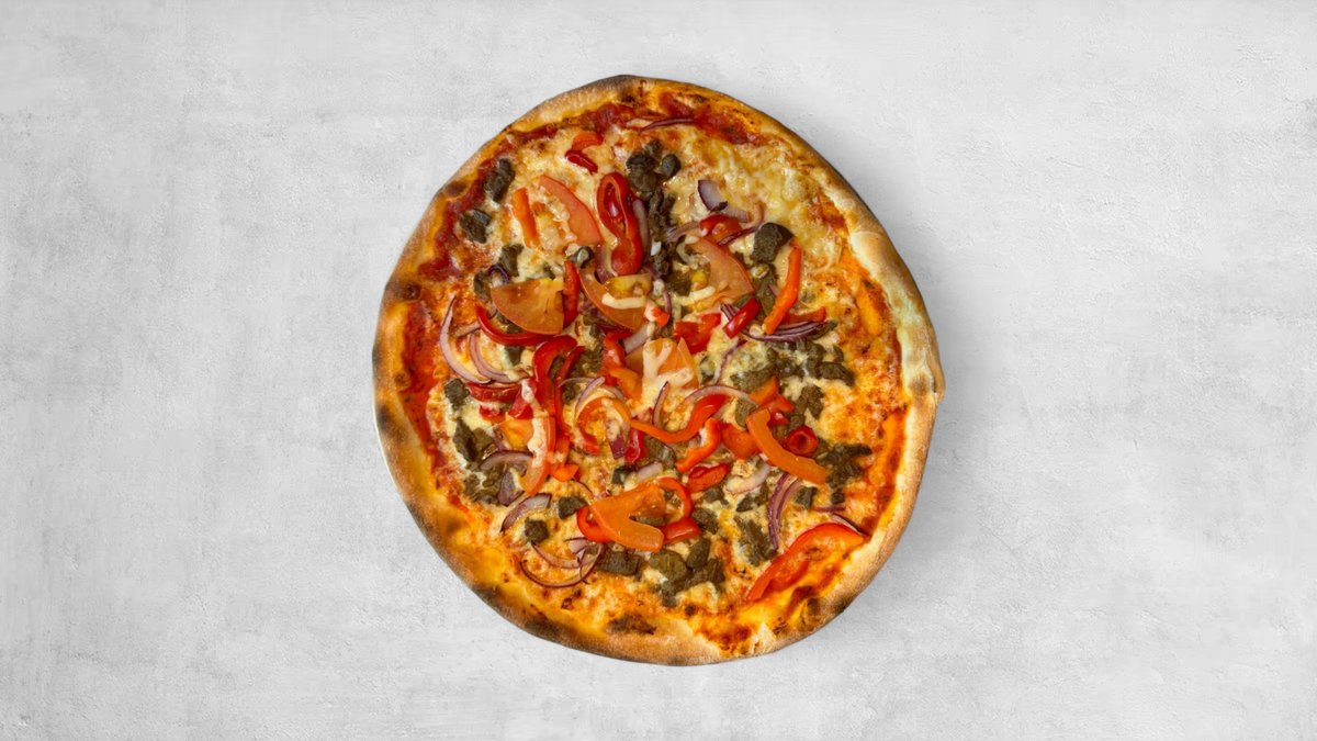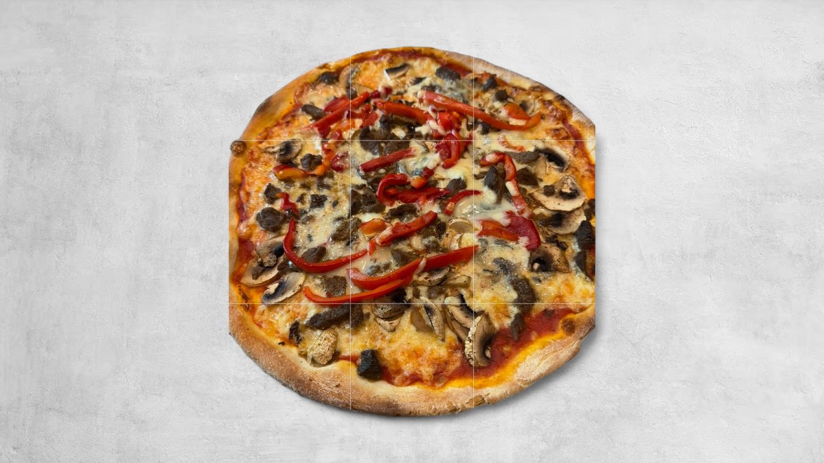 Tomat, ost, kødstrimler, gorgonzola, paprika og champignon.