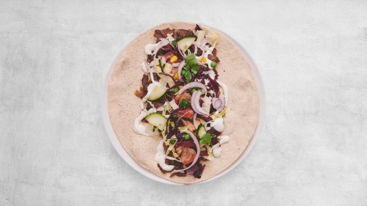 Lunt hjemmelavet fladbrød med fyld af valgfri protein, salat, tomat, løg, agurk og dressing.