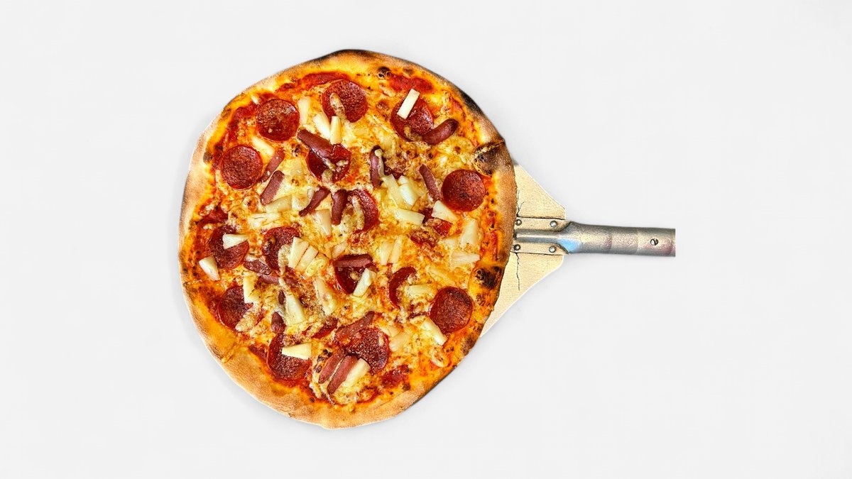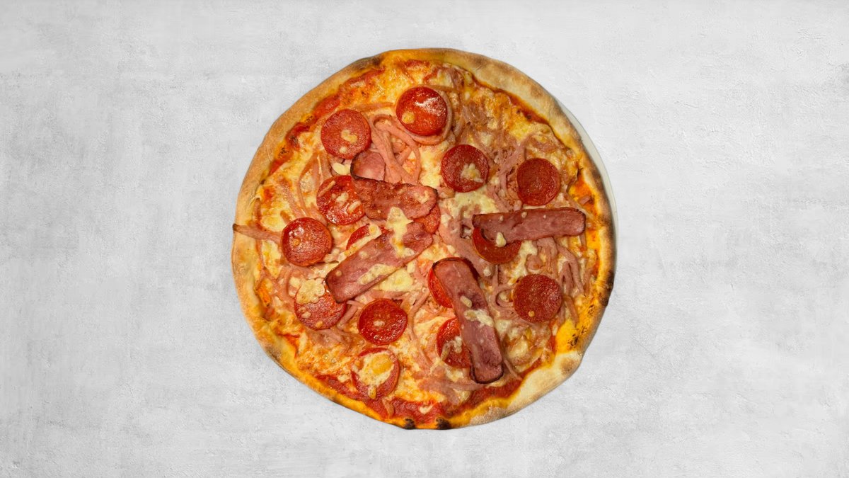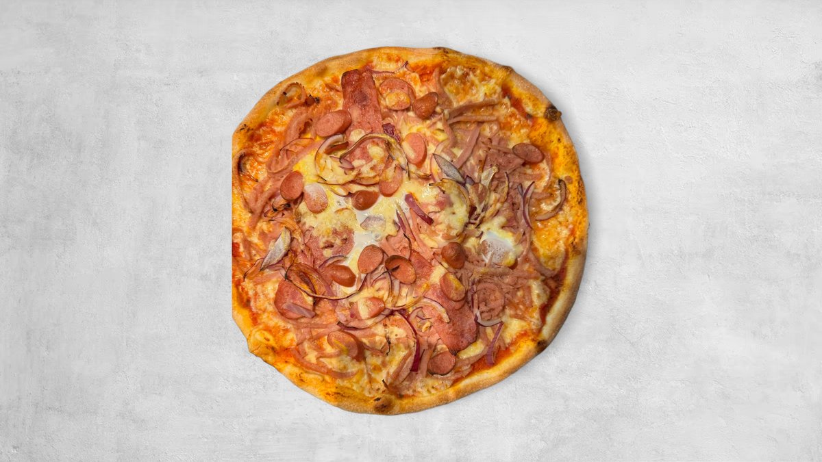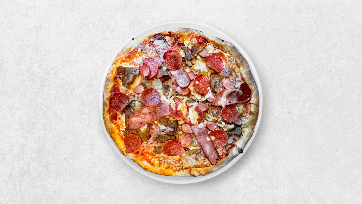 Tomat, ost, skinke, pepperoni, bacon, pølser.