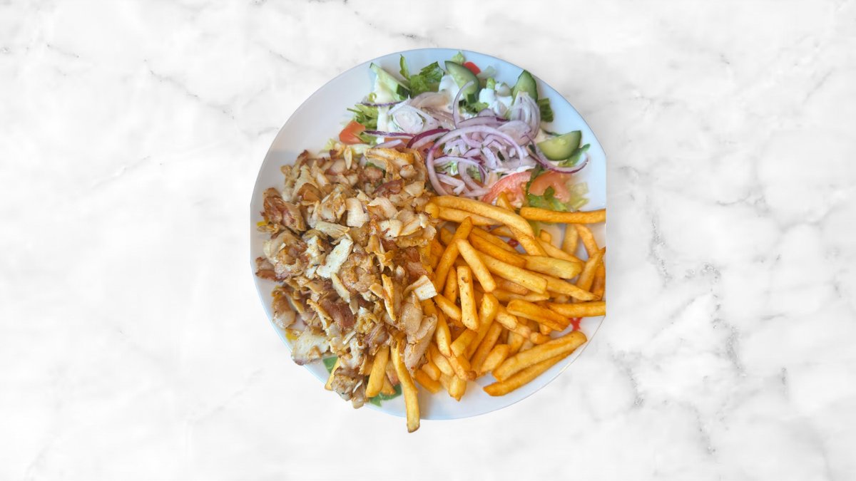 Kebab, kylling, pommes frites, frisk salat, tomater, agurker, løg, valgfri dressing og dyppelse.