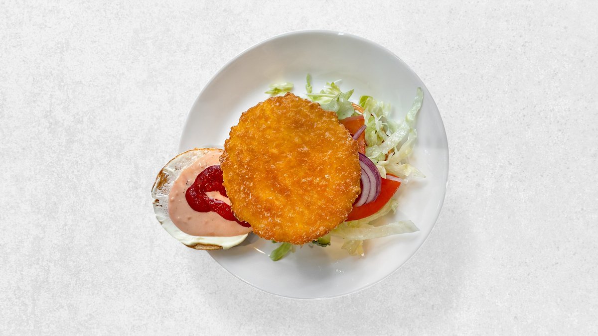 Indeholder salat, tomat, agurk, løg og smøres med salat mayonaise, ketchup og burgerdressing. Serveret med almindelig pommes frites, valgfri dyppelse og valgfri 0,5 l sodavand.
