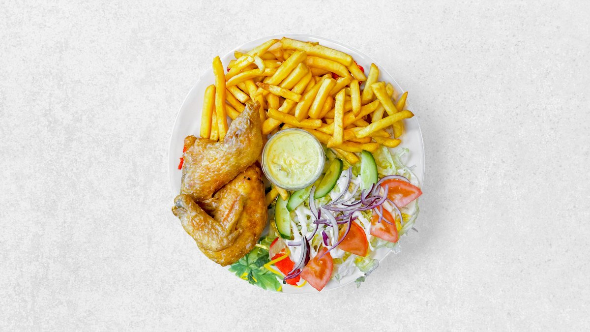 Kylling, pommes frites, frisk salat, tomater, agurker, løg, valgfri dressing og dyppelse.