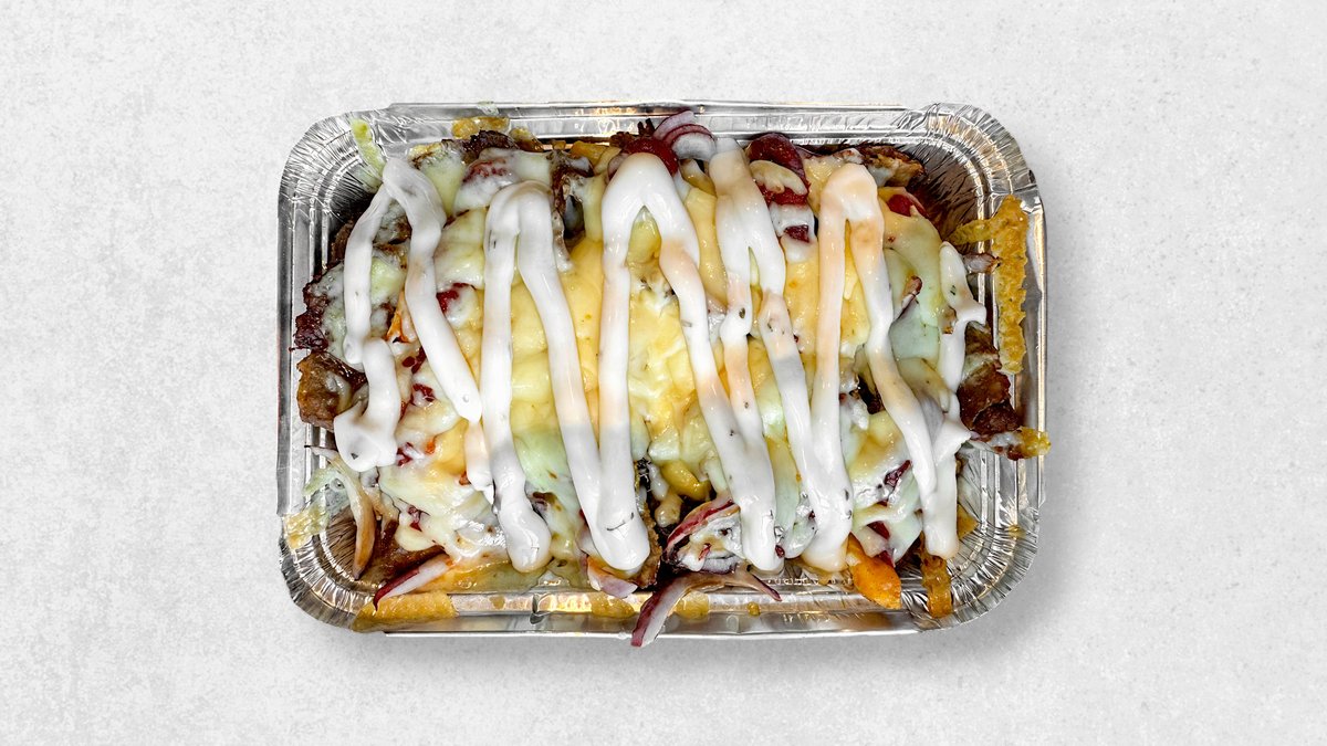 OVENBAGT Kebab, ost, løg, pommes frites, chili og dressing.