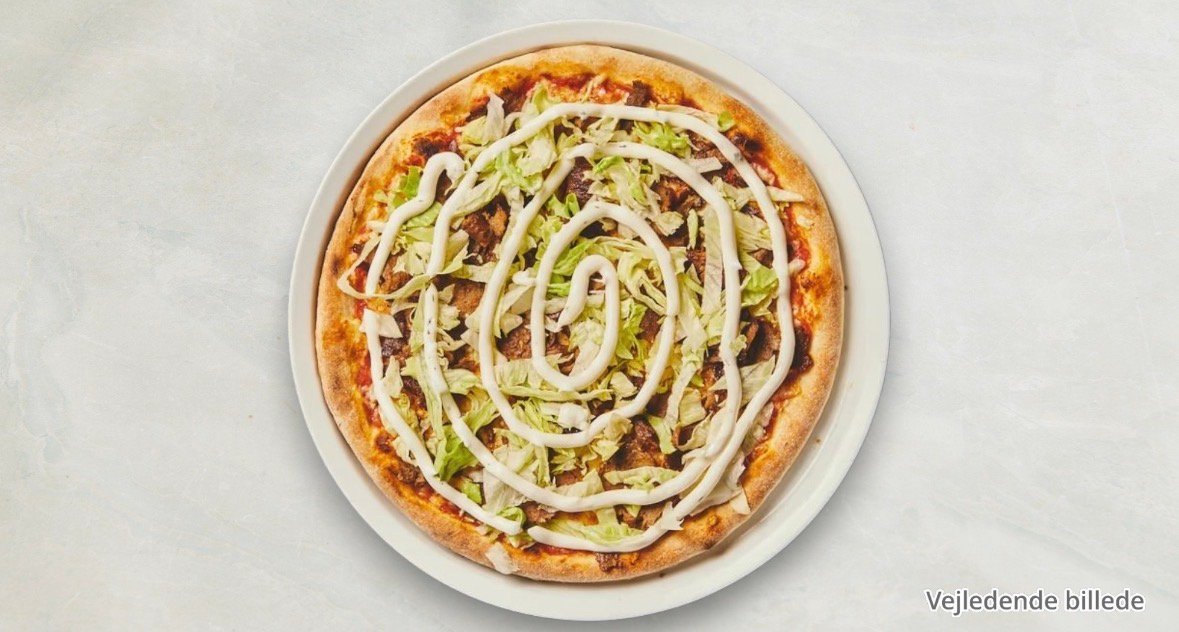 Tomat, ost, kebab, oliven, fetaost, jalapeños, chili og hvidløg.