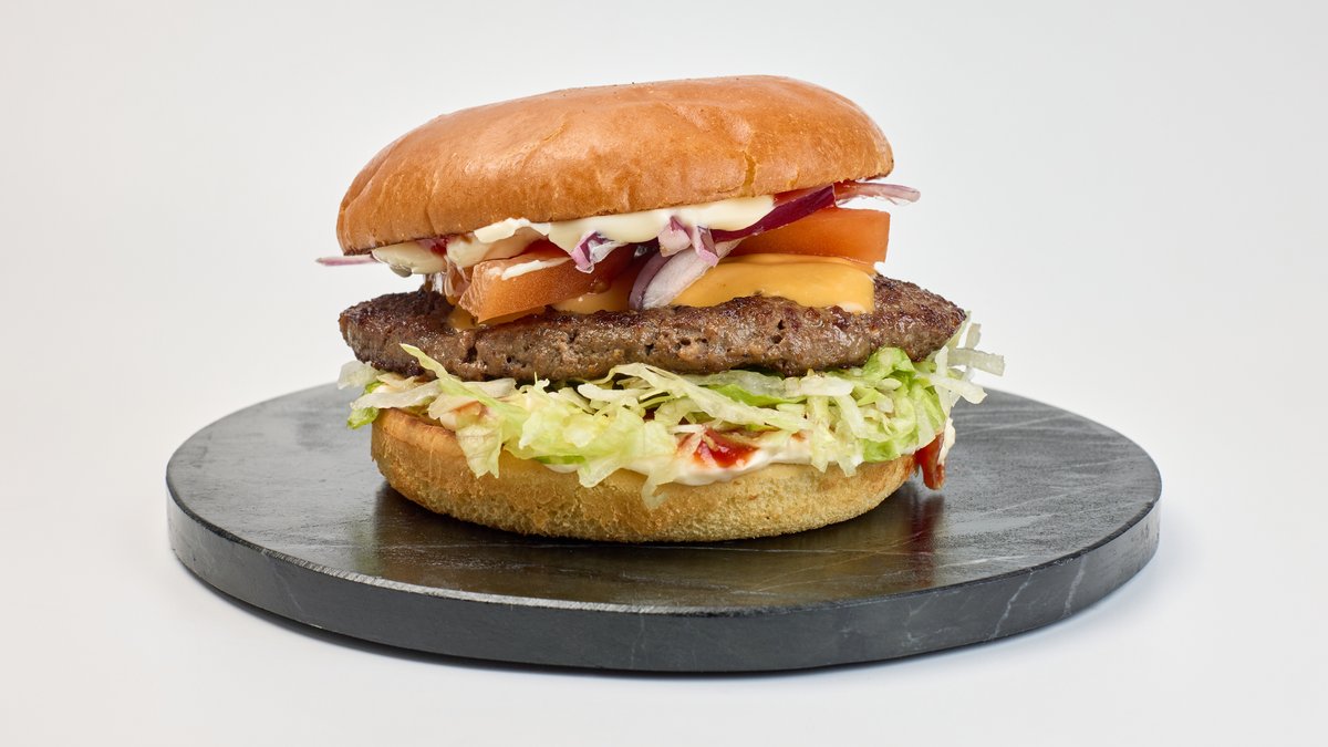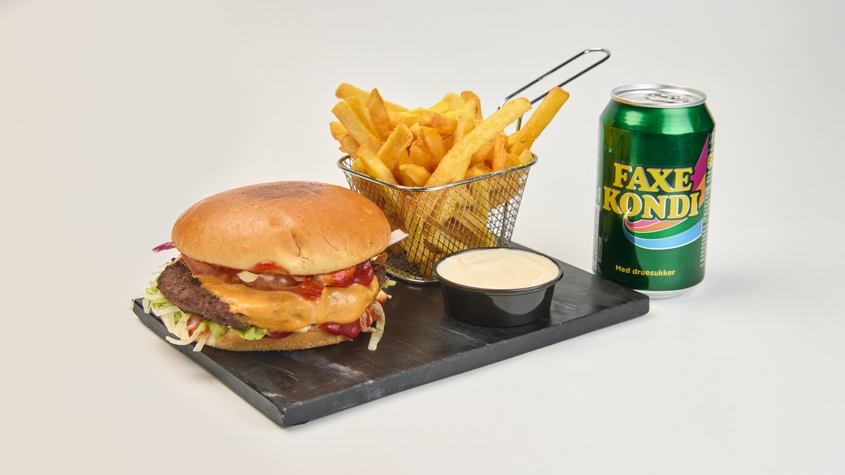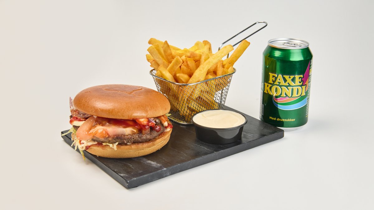 Briochebolle med fyld af bøf, ost, salat, tomat, løg og dressing. Serveres med en valgfri sodavand.
