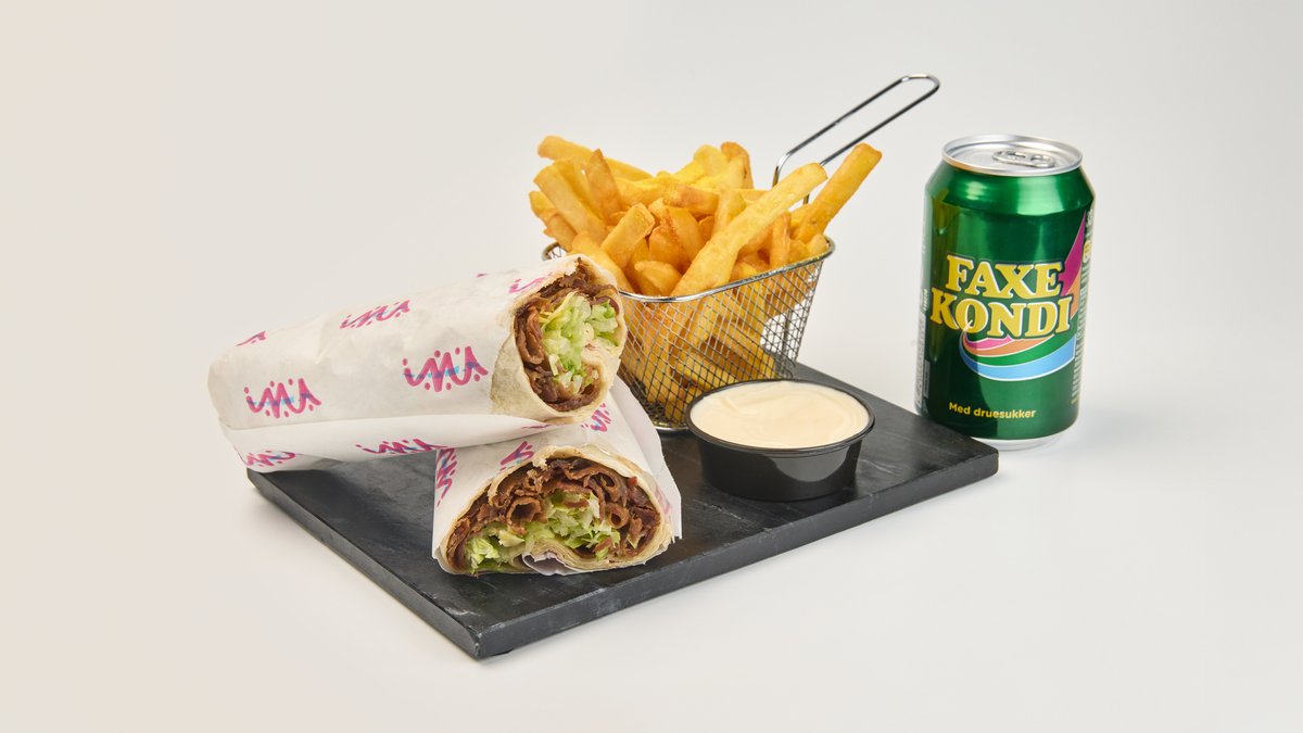Hjemmelavet fladbrød med fyld af valgfri protein, salat, tomat, løg og dressing. Serveres med en valgfri sodavand.