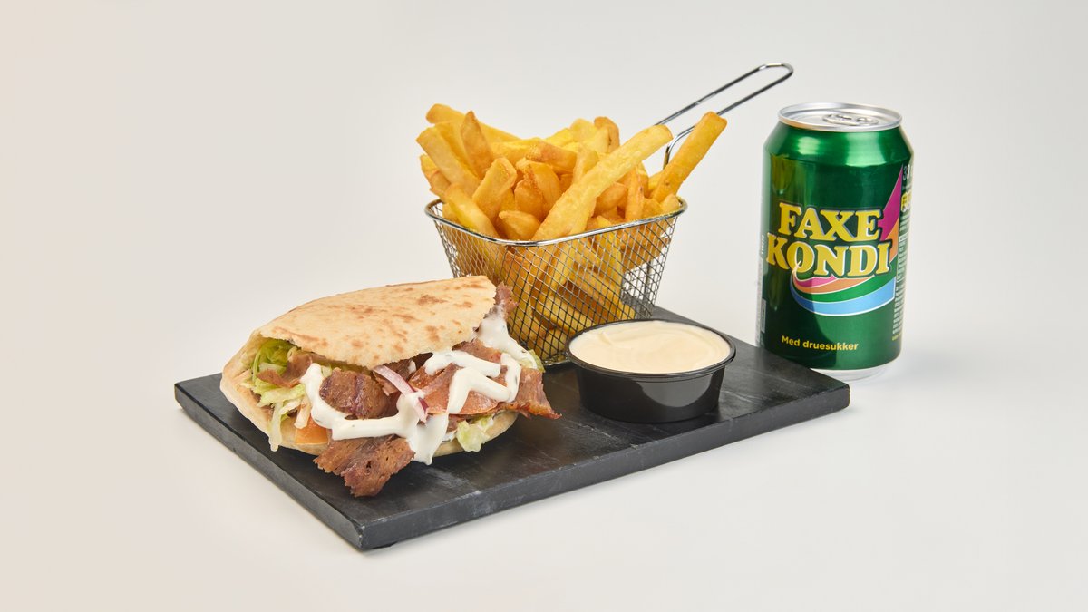 Hjemmelavet pitabrød med fyld af valgfri protein, salat, tomat, løg og dressing. Serveres med en valgfri sodavand.