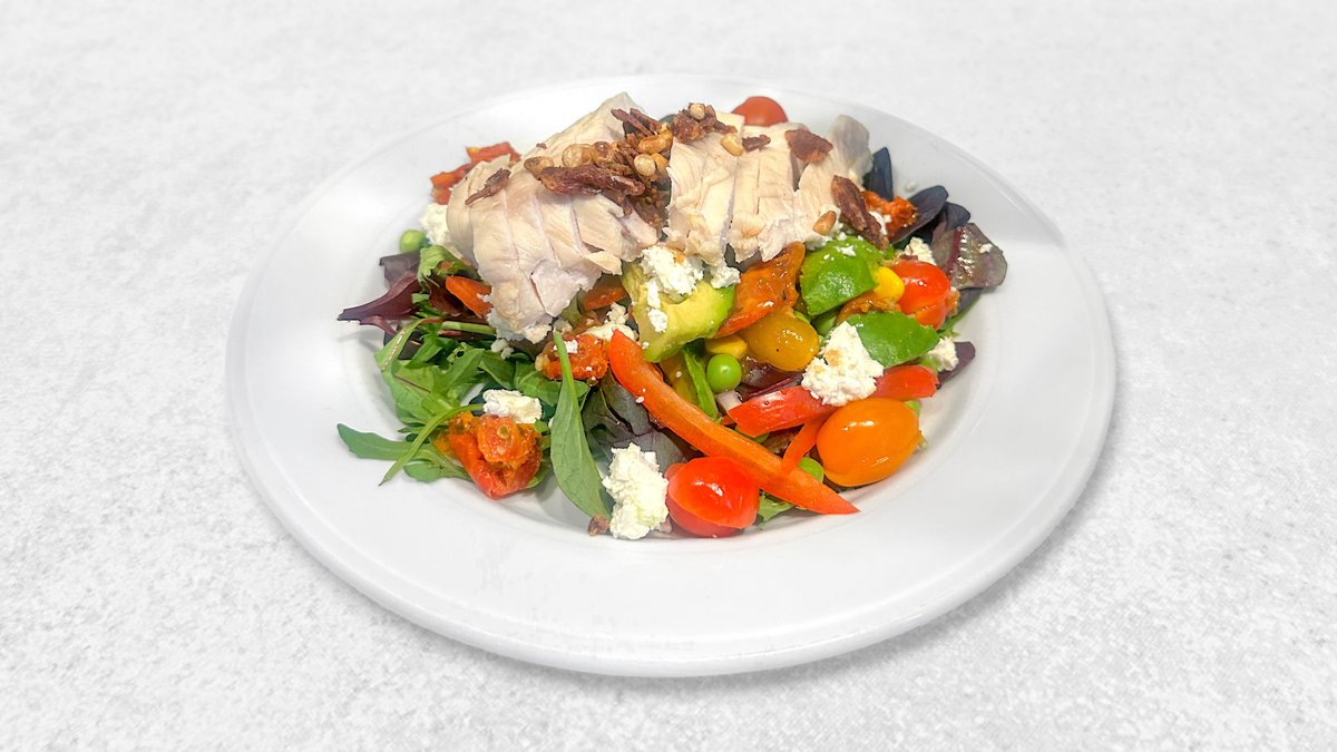 Kyllingebryst, bacon, salat, tomat, agurk og dressing.