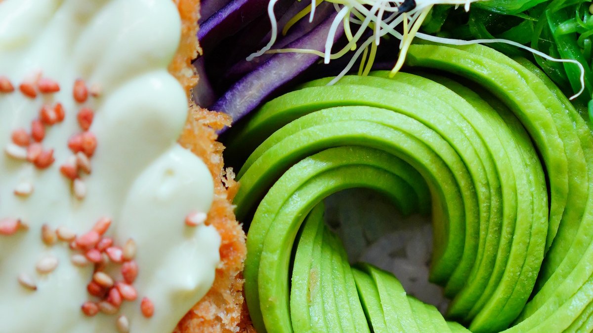 Tempurarejer med wasabimayo, avocado, edamame, gulerødder, tangsalat og rødkål.