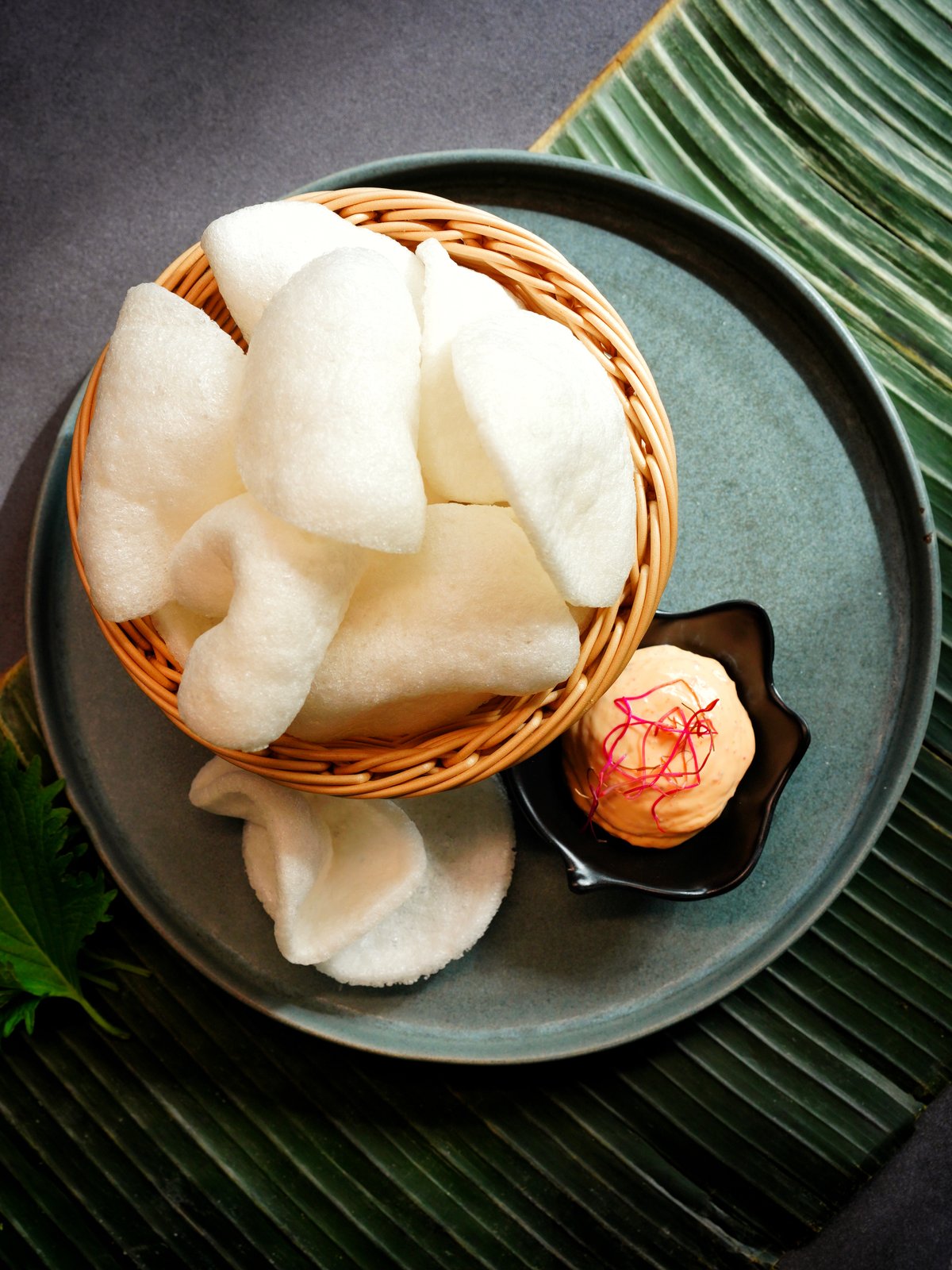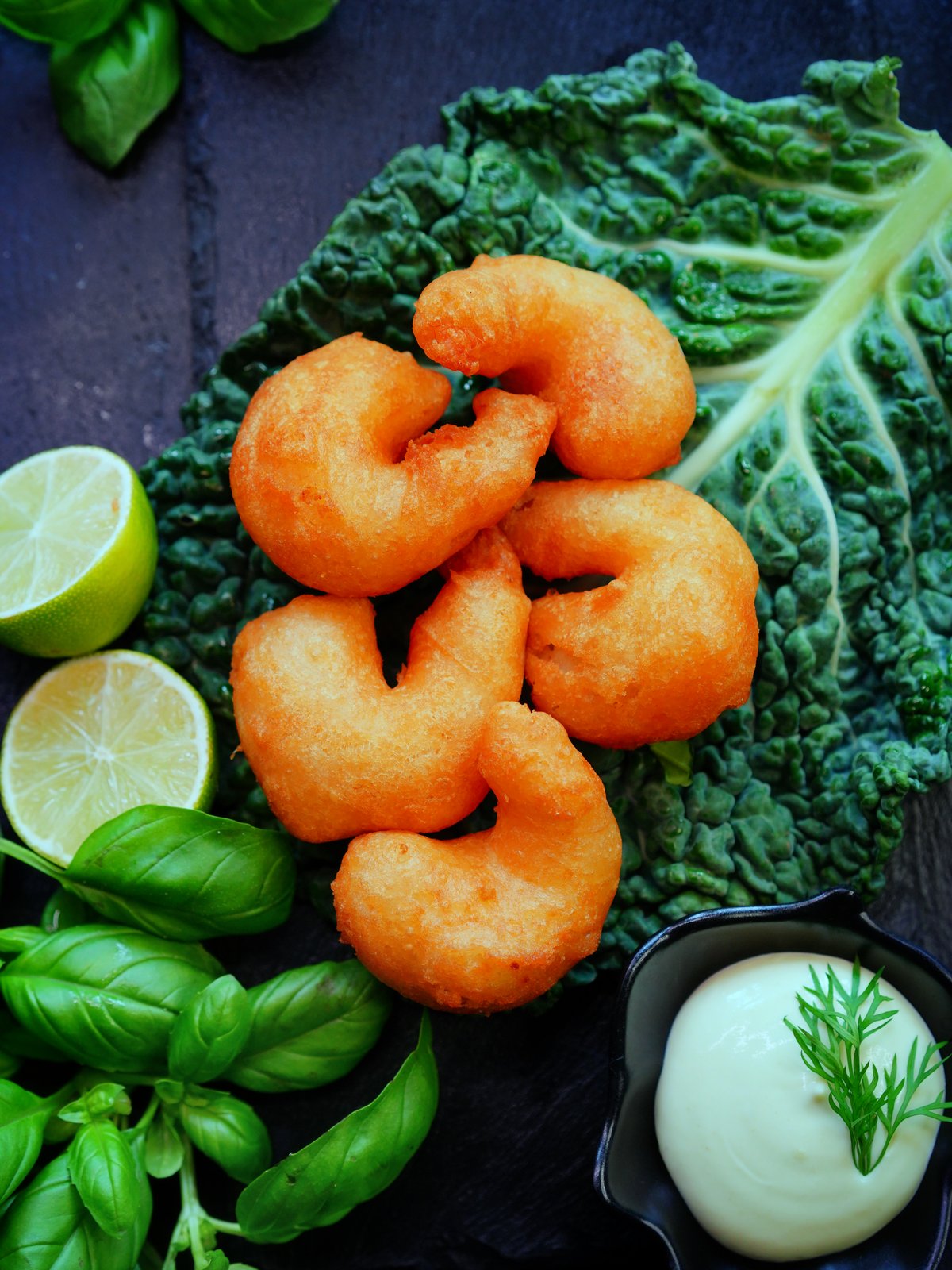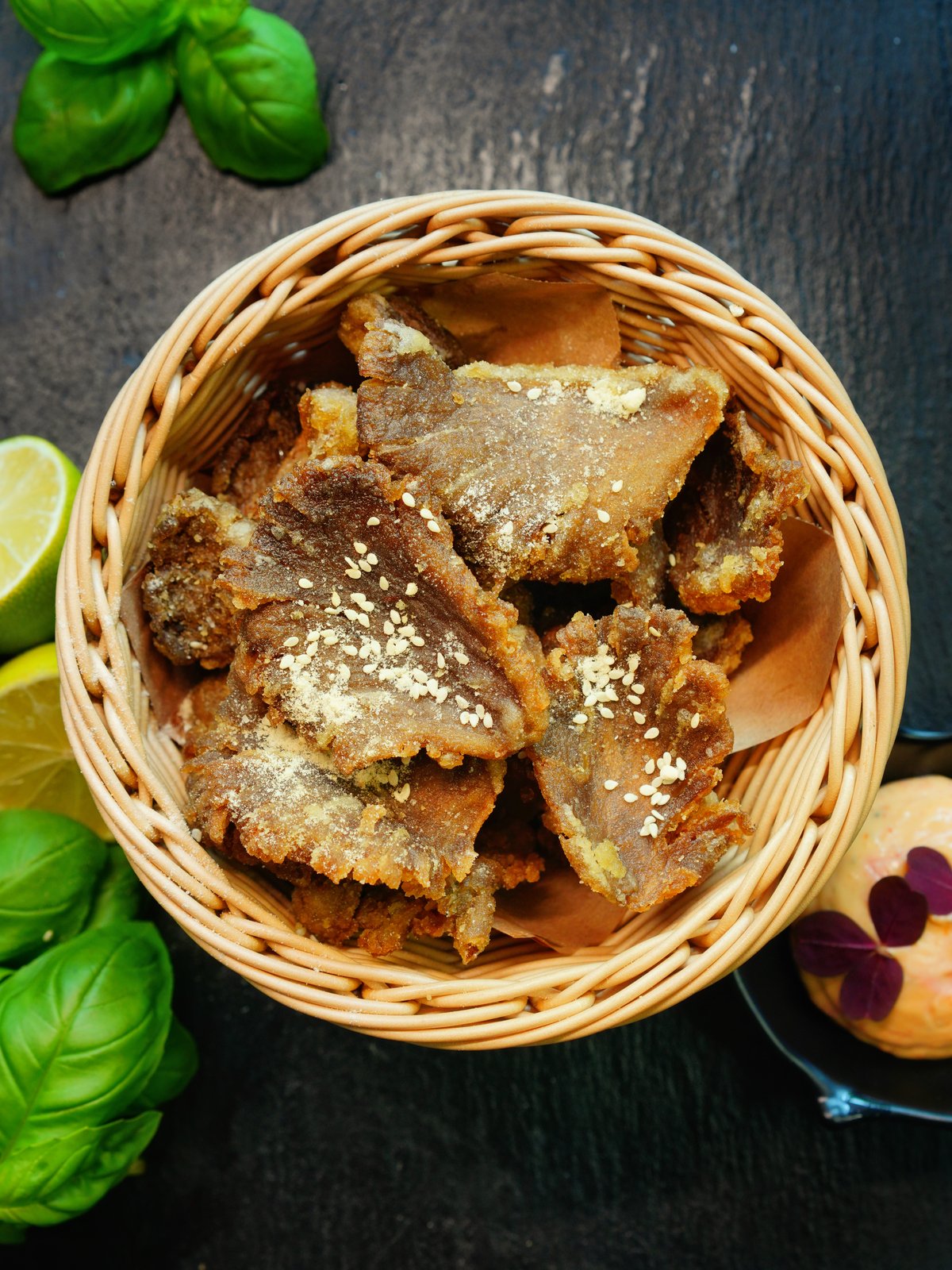 Sesamstegte svampe serveret med chilimayo.