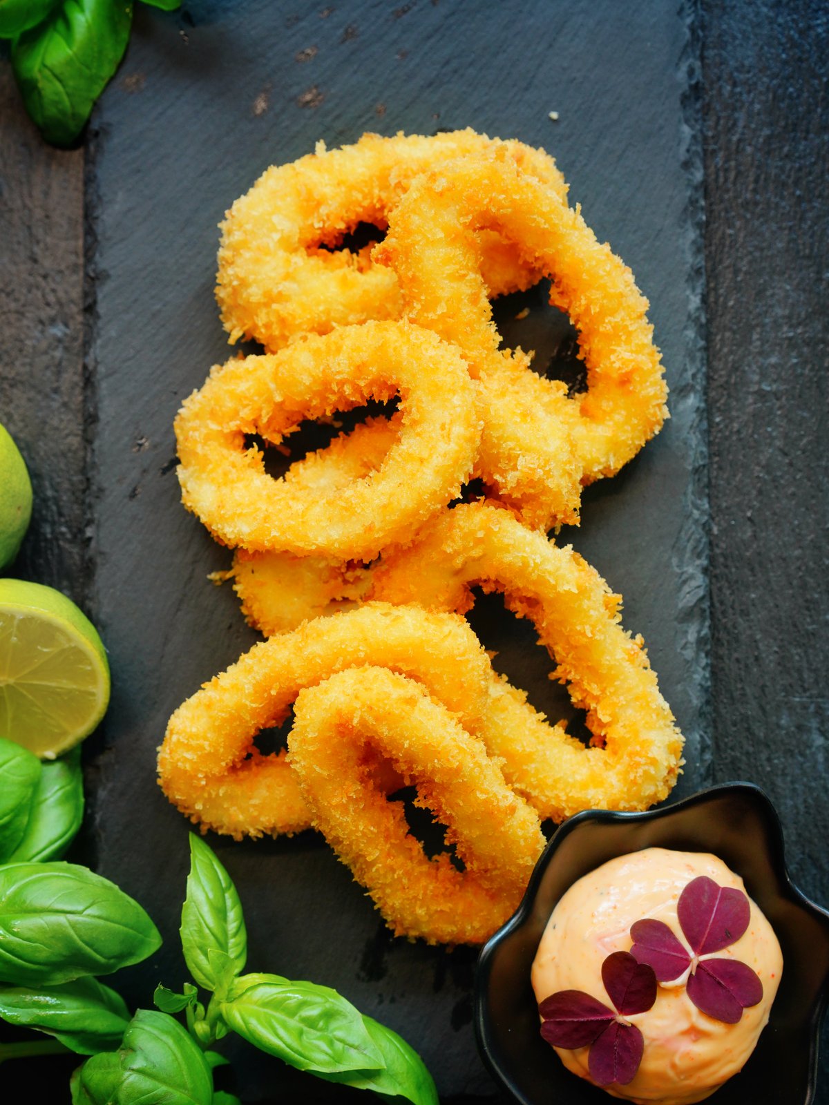 8 stk. Sprøde pankostegte blæksprutter serveret med chili mayo .