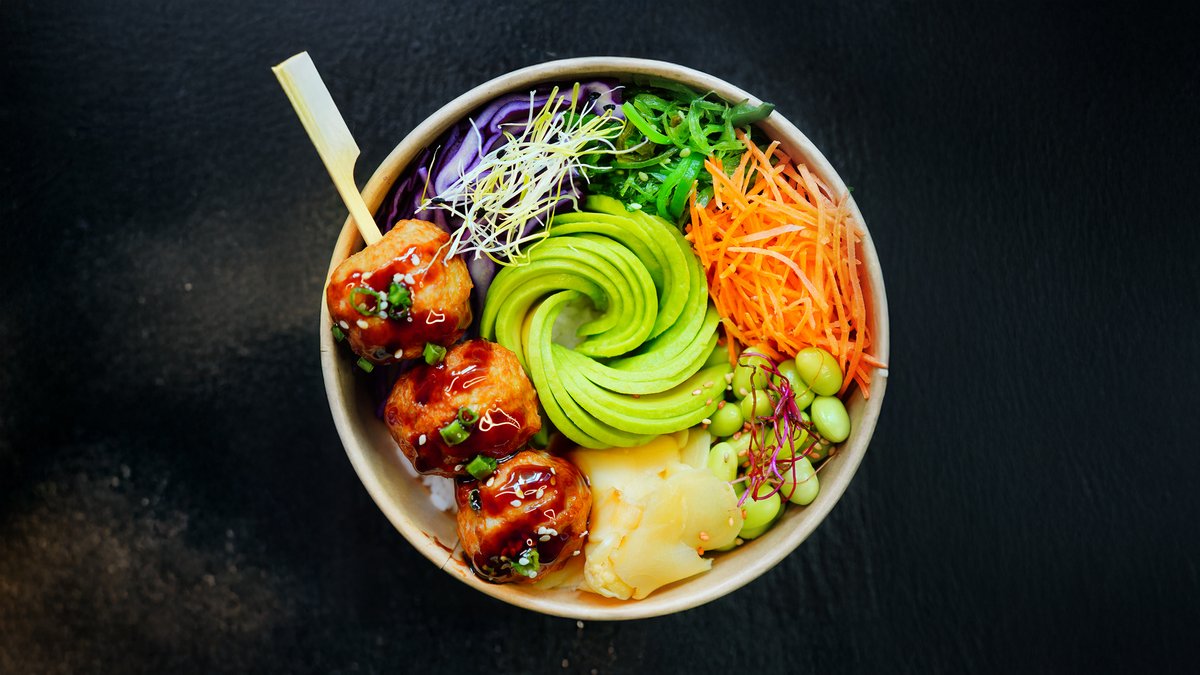 Kyllingeboller med teriyakisauce, avocado, edamame, gulerødder, tangsalat og rødkål.