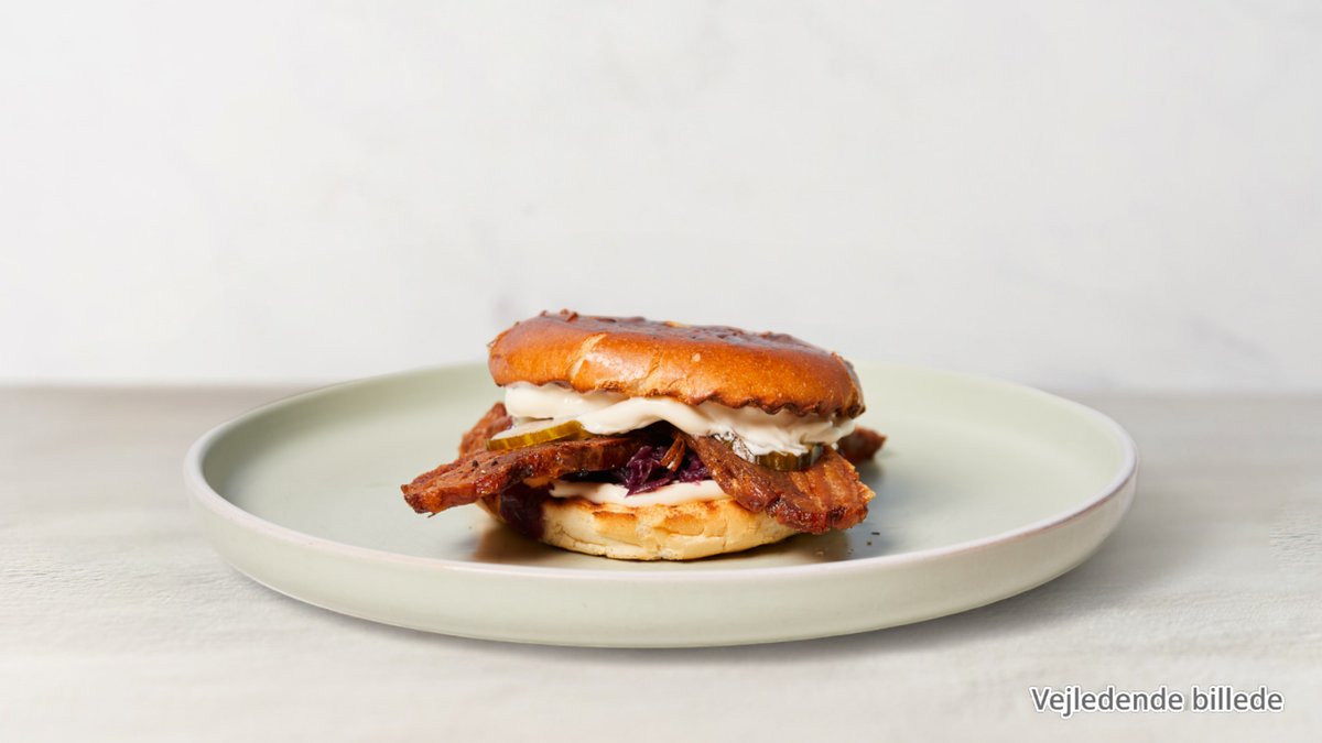 Burgerbolle med fyld af lille oksebøf, salat, tomat, løg, agurkesalat, burgerdressing og mayonnaise.