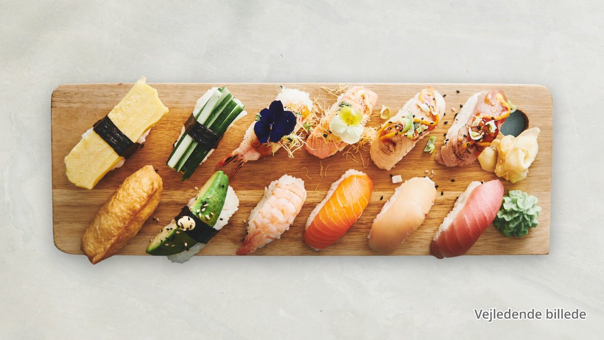Nigiri: 1 x Reje 1 x Tun 1 x Laks 1 x Flamberet laks Sushiruller efter eget valg: 8 x Uramaki 5 x Futomaki