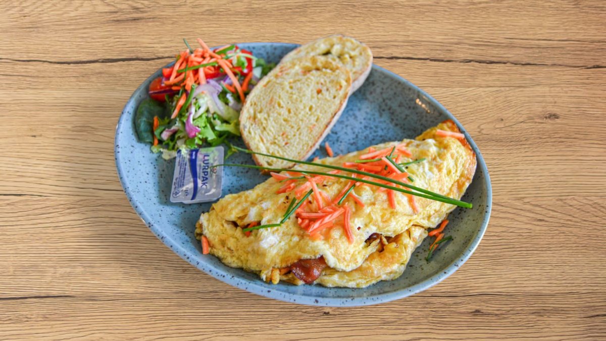 Kylling, bacon, salat, tomat, agurk, rødløg, ananas, friske urter og karrydressing.