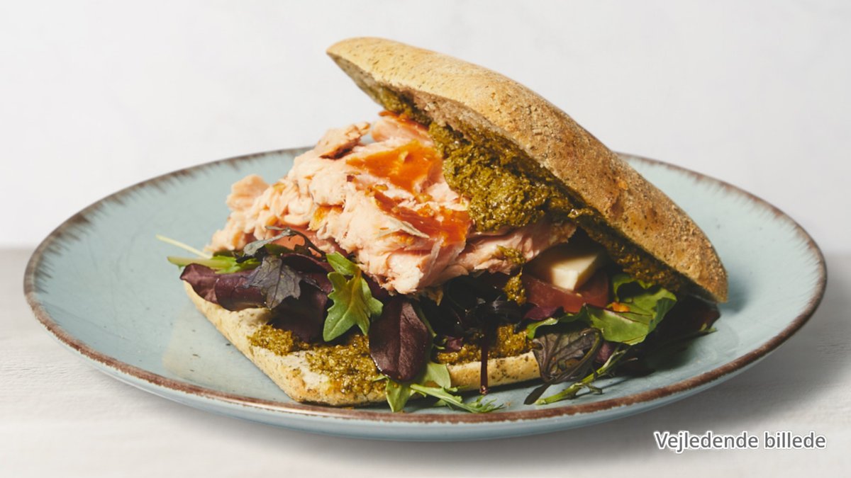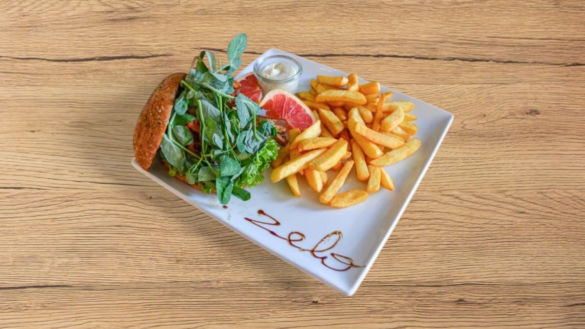 Sprødstegt serrano-skinke, avocado, rød pesto, hytteost og blandet grønt serveret med pommes frites og kryddermayo.