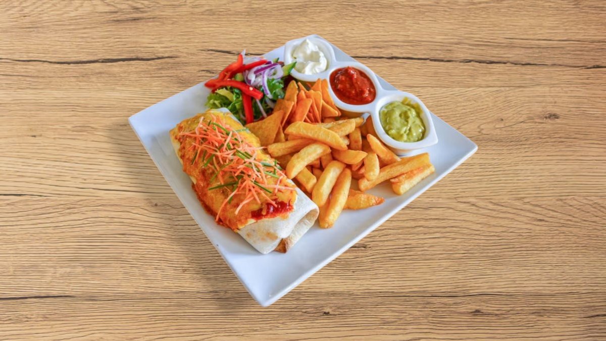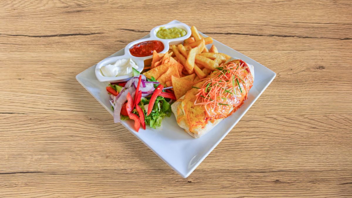 Krydret hakket oksekød vendt i mexicansk sauce og indbagt i tortillabrød gratineret med cheddar. Anrettet med blandet grønt, salsa, guacamole, creme fraiche og fritter.