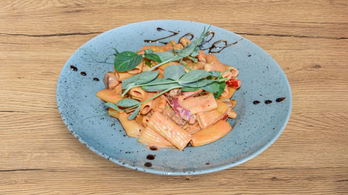 Pasta med oksestrimler, grøntsager, hvidløg, tomat- og flødesauce. Serveres med brød og smør.