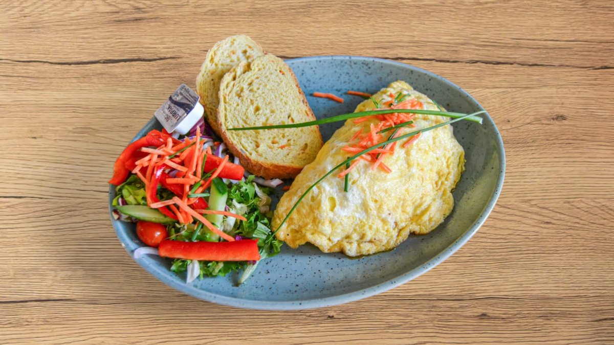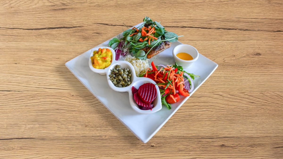 Blandet salat, cherrytomater, peberfrugt, rødløg, agurker, hjemmelavet tunmousse, rejer og kogt æg.